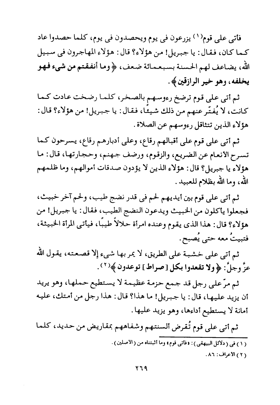 فأتى على قوم [ (1) ] يزرعون في يوم ويحصدون في يوم، كلما حصدوا عاد كما كان، فقال: يا جبريل! من هؤلاء؟ قال: هؤلاء المهاجرون في سبيل اللَّه، يضاعف لهم الحسنة بسبعمائة ضعف، وَما أَنْفَقْتُمْ مِنْ شَيْءٍ فَهُوَ يُخْلِفُهُ، وَهُوَ خَيْرُ الرَّازِقِينَ.