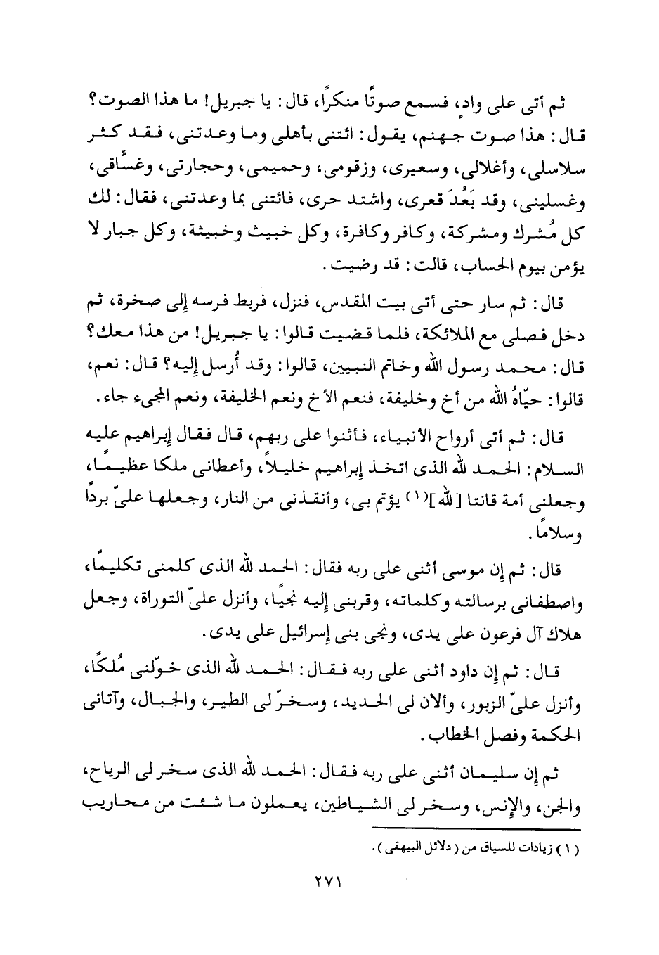 قال: ثم أتى أرواح الأنبياء، فأثنوا على ربهم، قال فقال إبراهيم عليه السلام: الحمد اللَّه الّذي اتخذ إبراهيم خليلا، وأعطانى ملكا عظيما، وجعلني أمة قانتا [للَّه] [ (1) ] يؤتم بى، وأنقذنى من النار، وجعلها عليّ بردا وسلاما.