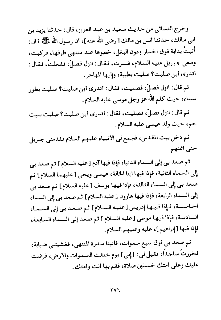 وخرج النسائي من حديث سعيد بن عبد العزيز، قال: حدثنا يزيد بن أبى مالك، حدثنا أنس بن مالك [رضى اللَّه عنه] ، أن رسول اللَّه صلّى اللَّه عليه وسلّم قال: أتيت بدابة فوق الحمار ودون البغل، خطوها عند منتهى طرفها، فركبت، ومعى جبريل عليه السلام، فسرت، فقال: انزل فصلّ، ففعلت، فقال: