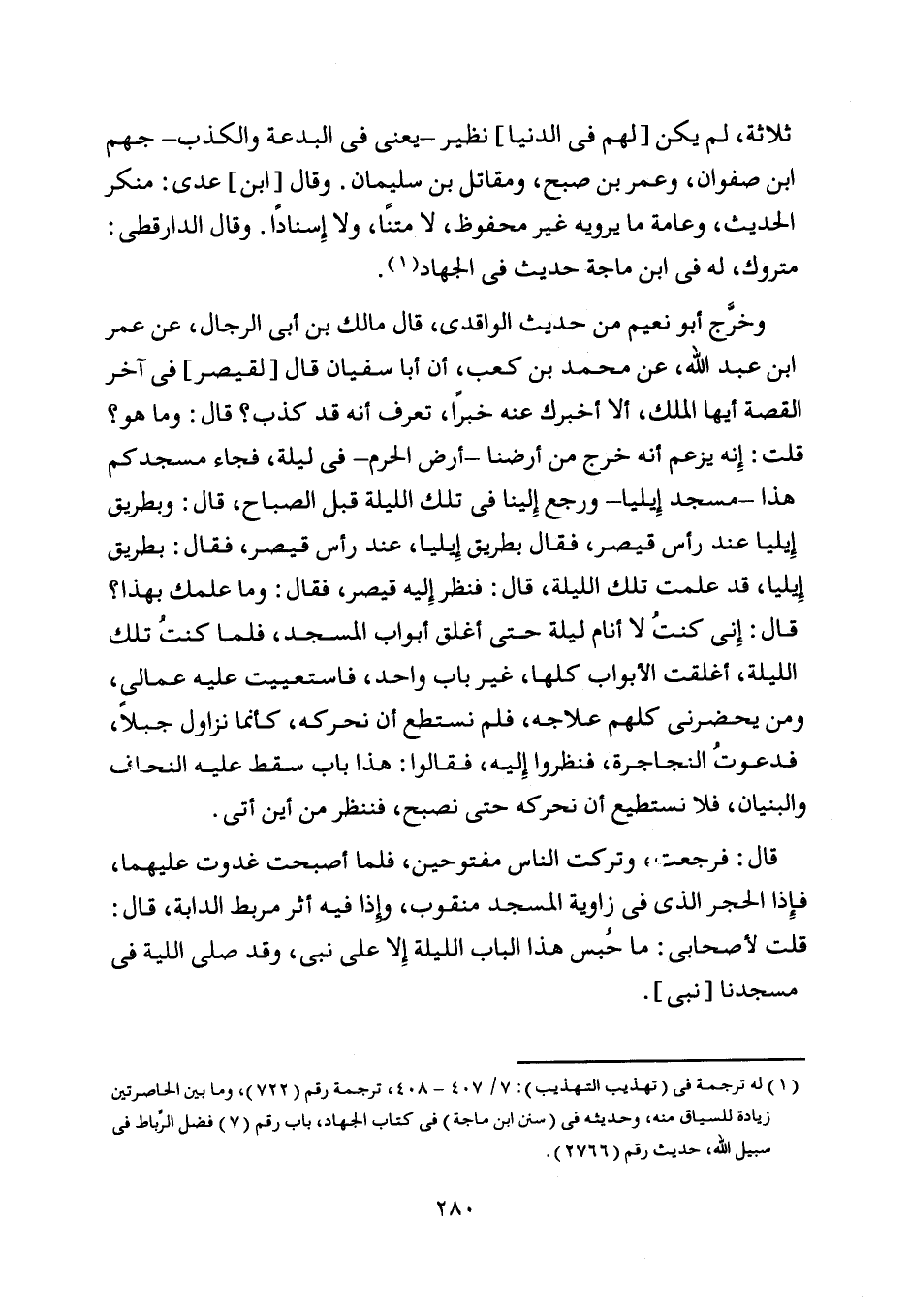 قلت: إنه يزعم أنه خرج من أرضنا- أرض الحرم- في ليلة، فجاء مسجدكم هذا- مسجد إيليا- ورجع إلينا في تلك الليلة قبل الصباح، قال: وبطريق إيليا عند رأس قيصر، فقال بطريق إيليا، عند رأس قيصر، فقال: بطريق إيليا، قد علمت تلك الليلة، قال: فنظر إليه قيصر، فقال: وما علمك بهذا؟