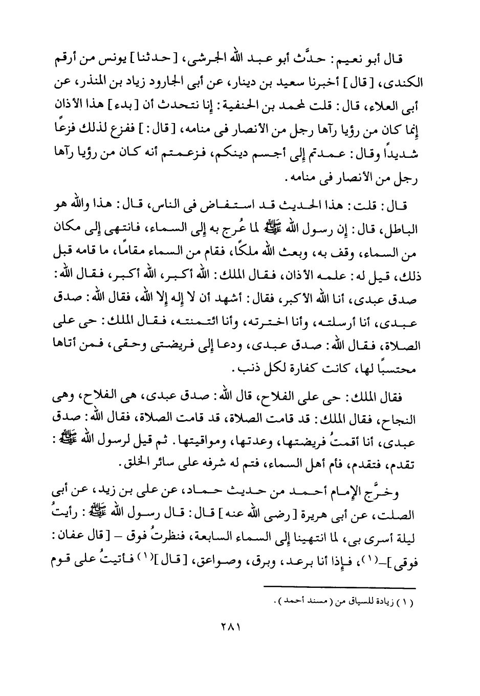 قال: قلت: هذا الحديث قد استفاض في الناس، قال: هذا واللَّه هو الباطل، قال: إن رسول اللَّه صلّى اللَّه عليه وسلّم لما عرج به إلى السماء، فانتهى إلى مكان من السماء، وقف به، وبعث اللَّه ملكا، فقام من السماء مقاما، ما قامه قبل ذلك، قيل له: علمه الأذان، فقال الملك: اللَّه أكبر، اللَّه أكبر، فقال اللَّه: