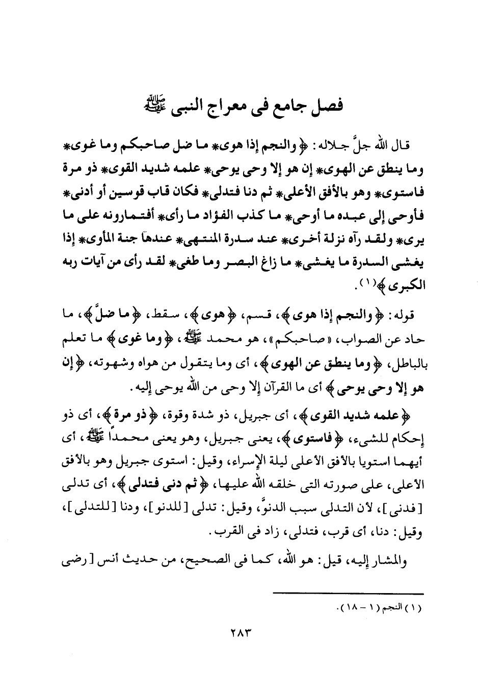 قال اللَّه جلّ جلاله: وَالنَّجْمِ إِذا هَوى * ما ضَلَّ صاحِبُكُمْ وَما غَوى * وَما يَنْطِقُ عَنِ الْهَوى * إِنْ هُوَ إِلَّا وَحْيٌ يُوحى * عَلَّمَهُ شَدِيدُ الْقُوى * ذُو مِرَّةٍ فَاسْتَوى * وَهُوَ بِالْأُفُقِ الْأَعْلى * ثُمَّ دَنا فَتَدَلَّى* فَكانَ قابَ قَوْسَيْنِ أَوْ أَدْنى * فَأَوْحى إِلى عَبْدِهِ ما أَوْحى * ما كَذَبَ الْفُؤادُ ما رَأى * أَفَتُمارُونَهُ عَلى ما يَرى * وَلَقَدْ رَآهُ نَزْلَةً أُخْرى * عِنْدَ سِدْرَةِ الْمُنْتَهى * عِنْدَها جَنَّةُ الْمَأْوى * إِذْ يَغْشَى السِّدْرَةَ ما يَغْشى * ما زاغَ الْبَصَرُ وَما طَغى * لَقَدْ رَأى مِنْ آياتِ رَبِّهِ الْكُبْرى [ (1) ] .