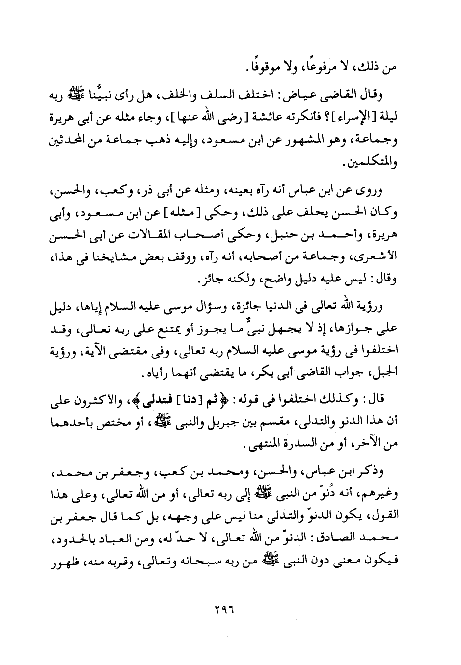 وقال القاضي عياض: اختلف السلف والخلف، هل رأى نبيّنا صلّى اللَّه عليه وسلّم ربه ليلة [الإسراء] ؟ فأنكرته عائشة [رضى اللَّه عنها] ، وجاء مثله عن أبى هريرة وجماعة، وهو المشهور عن ابن مسعود، وإليه ذهب جماعة من المحدثين والمتكلمين.