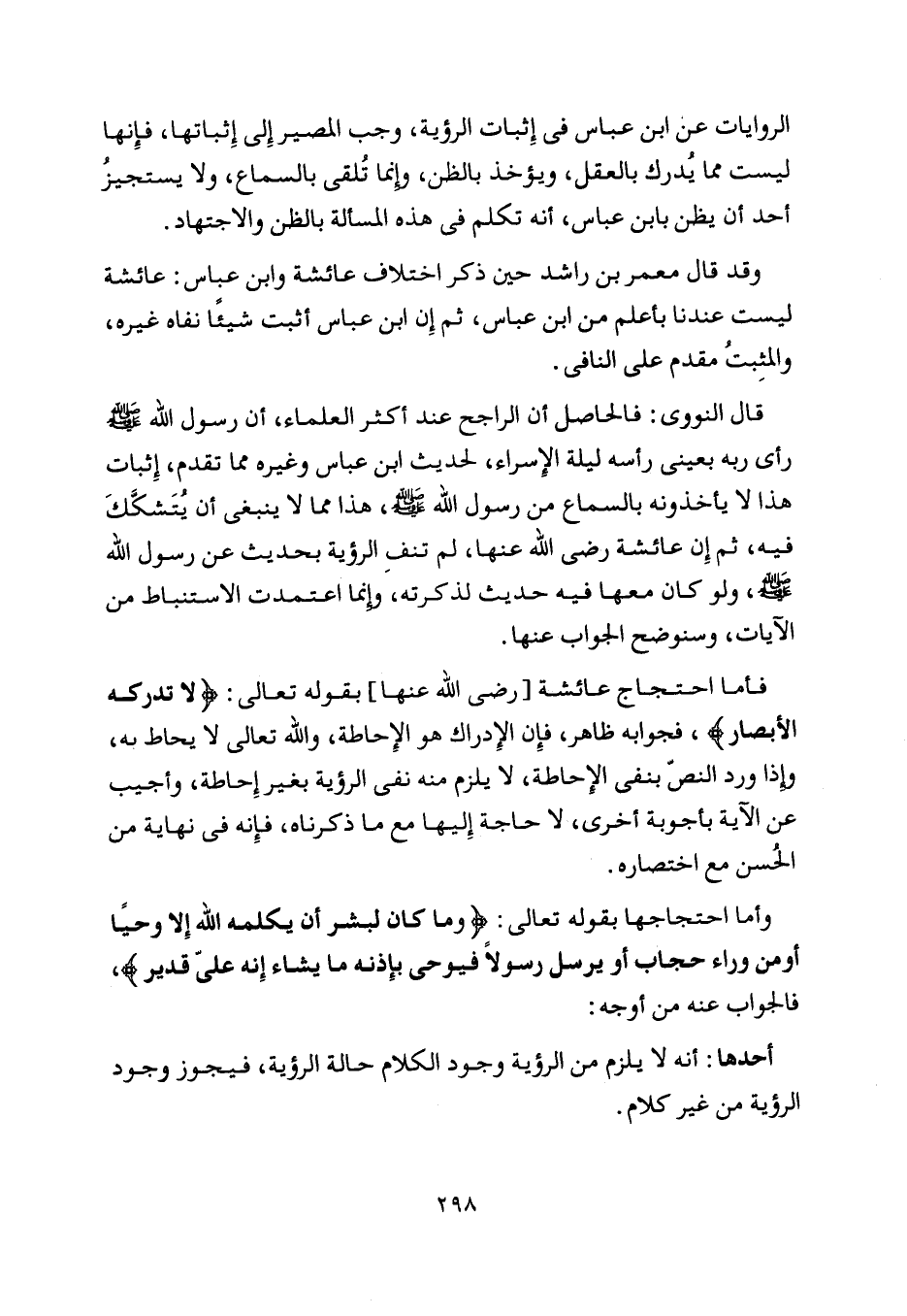 قال النووي: فالحاصل أن الراجح عند أكثر العلماء، أن رسول اللَّه صلّى اللَّه عليه وسلّم رأى ربه بعيني رأسه ليلة الإسراء، لحديث ابن عباس وغيره مما تقدم، إثبات هذا لا يأخذونه بالسماع من رسول اللَّه صلّى اللَّه عليه وسلّم، هذا مما لا ينبغي أن يتشكّك فيه، ثم إن عائشة رضى اللَّه عنها، لم تنف الرؤية بحديث عن رسول اللَّه صلّى اللَّه عليه وسلّم، ولو كان معها فيه حديث لذكرته، وإنما اعتمدت الاستنباط من الآيات، وسنوضح الجواب عنها.