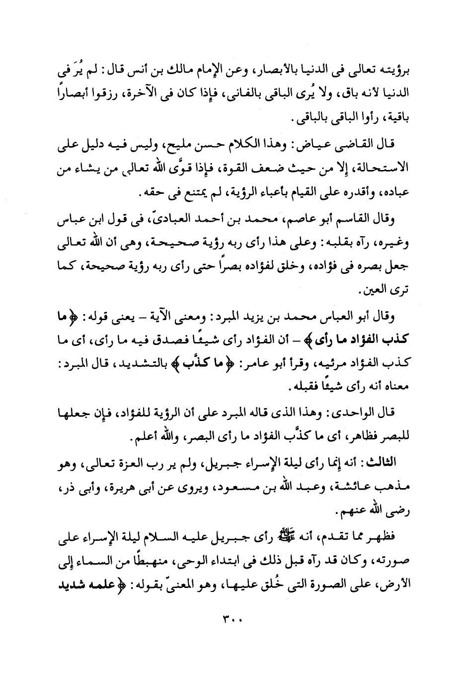 وقال القاسم أبو عاصم، محمد بن أحمد العبادىّ، في قول ابن عباس وغيره، رآه بقلبه: وعلى هذا رأى ربه رؤية صحيحة، وهي أن اللَّه تعالى جعل بصره في فؤاده، وخلق لفؤاده بصرا حتى رأى ربه رؤية صحيحة، كما ترى العين.