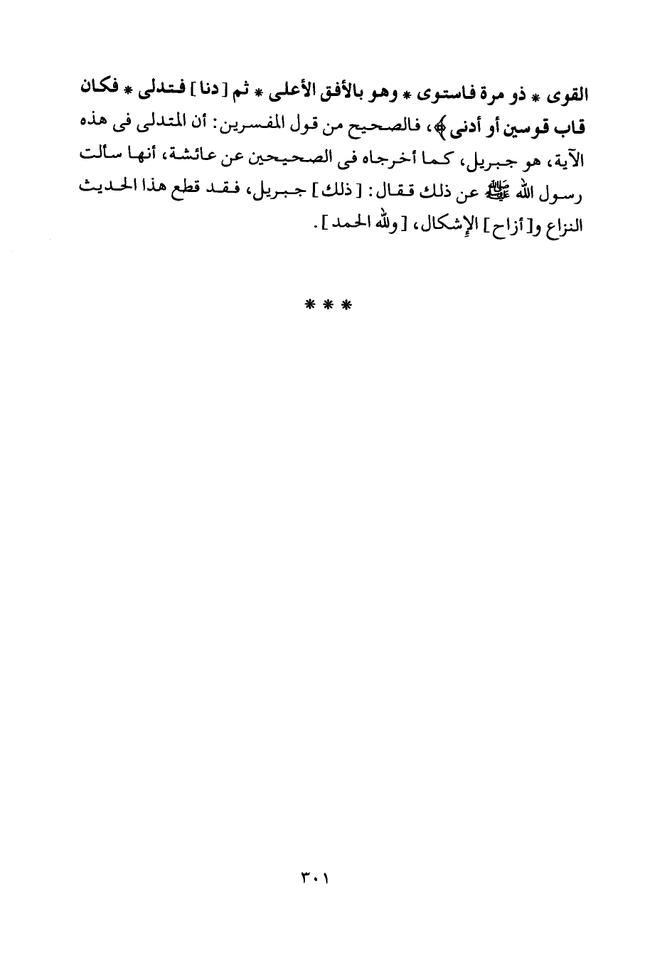 الْقُوى * ذُو مِرَّةٍ فَاسْتَوى * وَهُوَ بِالْأُفُقِ الْأَعْلى * ثُمَّ [دَنا] فَتَدَلَّى* فَكانَ قابَ قَوْسَيْنِ أَوْ أَدْنى، فالصحيح من قول المفسرين: أن المتدلى في هذه الآية، هو جبريل،
