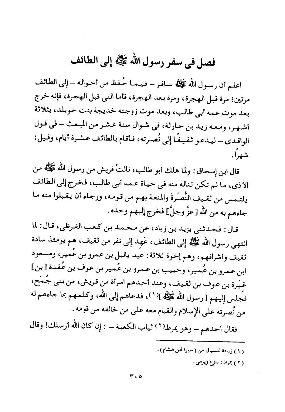 اعلم أن رسول اللَّه صلّى اللَّه عليه وسلّم سافر- فيما حفظ من أحواله- إلى الطائف مرتين، مرة قبل الهجرة، ومرة بعد الهجرة، فأما التي قبل الهجرة، فإنه خرج بعد موت عمه أبى طالب، وبعد موت زوجته خديجة بنت خويلد، بثلاثة أشهر، ومعه زيد بن حارثة، في شوال سنة عشر من المبعث- في قول الواقدي- ليدعو ثقيفا إلى نصرته، فأقام بالطائف عشرة أيام، وقيل: