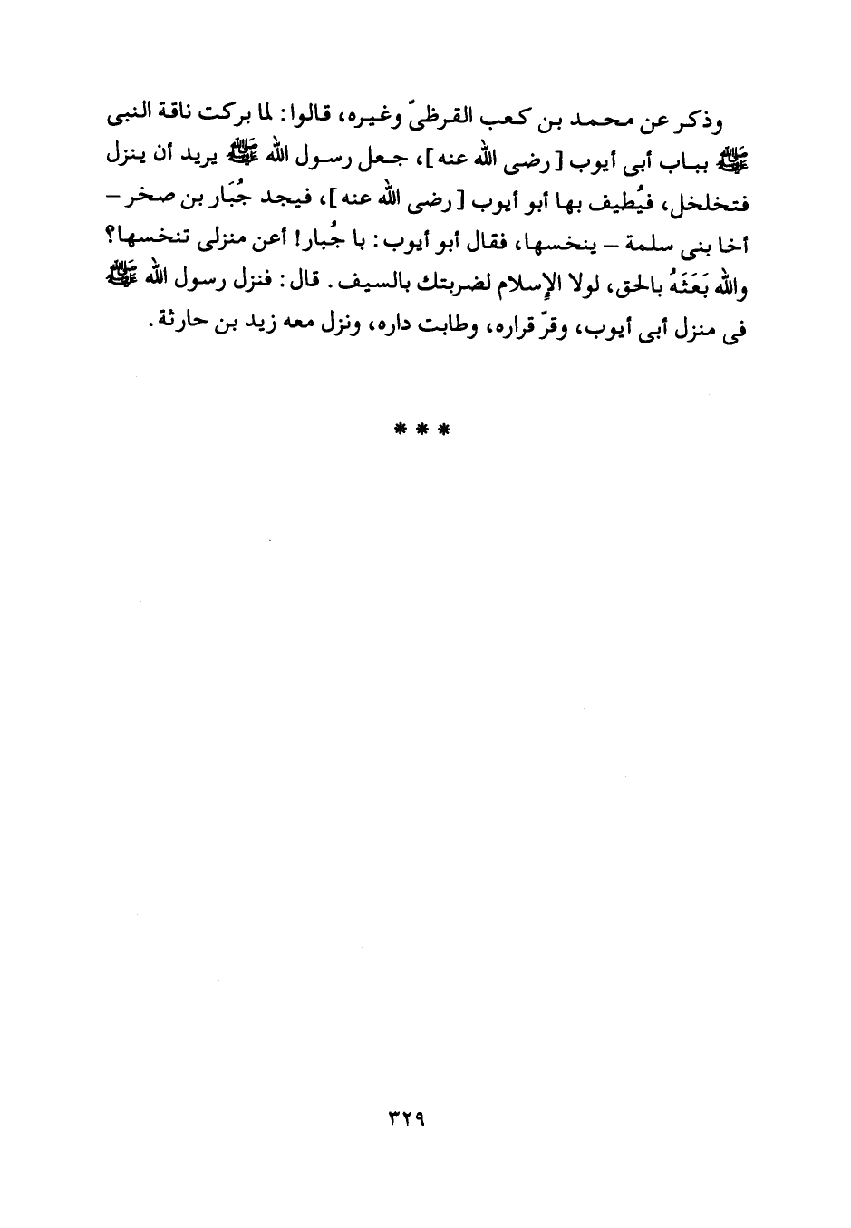 واللَّه بعثه بالحق، لولا الإسلام لضربتك بالسيف. قال: فنزل رسول اللَّه صلّى اللَّه عليه وسلّم في منزل أبى أيوب، وقرّ قراره، وطابت داره، ونزل معه زيد بن حارثة.