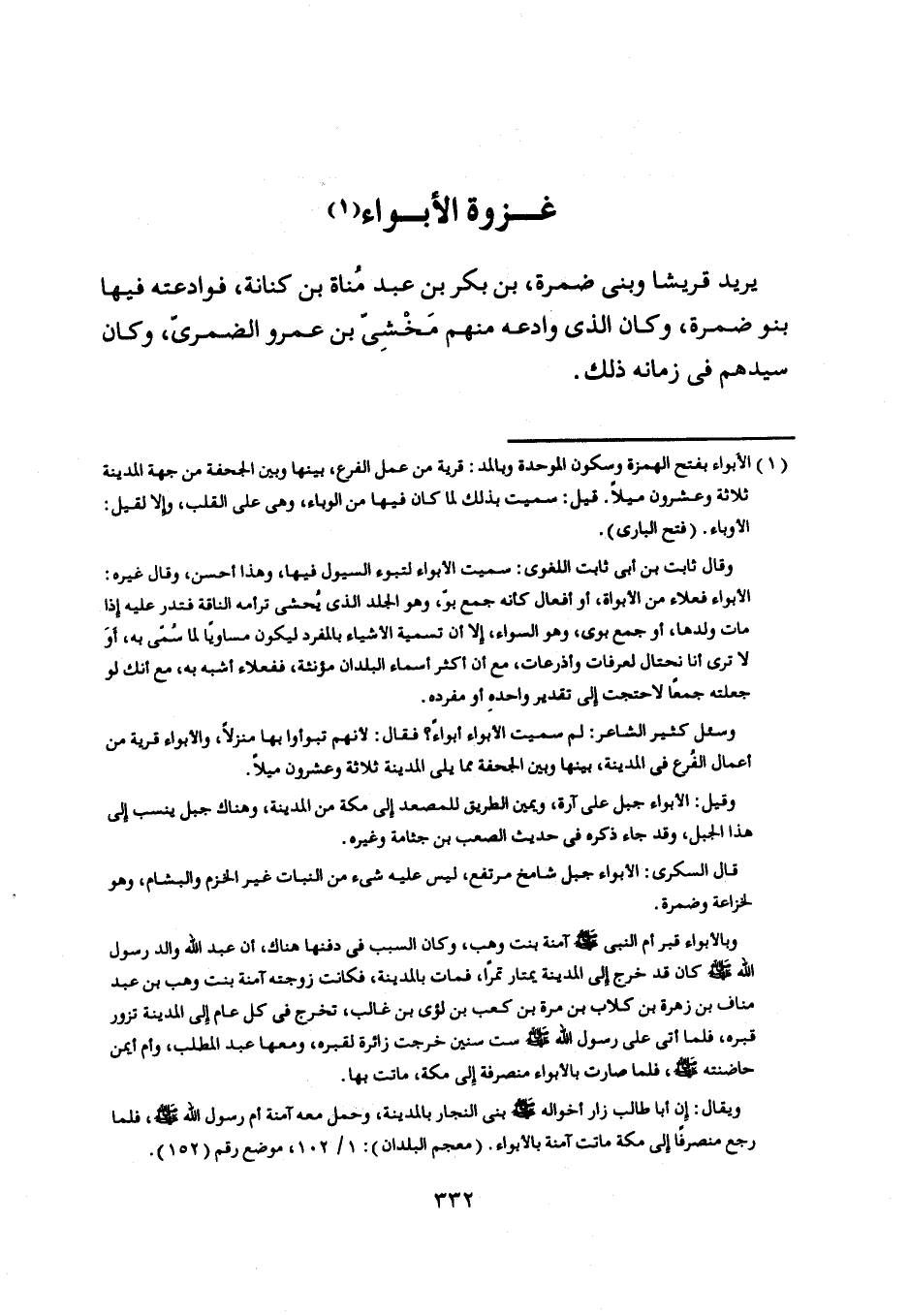[ (1) ] الأبواء بفتح الهمزة وسكون الموحدة وبالمد: قرية من عمل الفرع، بينها وبين الجحفة من جهة المدينة ثلاثة وعشرون ميلا. قيل: سميت بذلك لما كان فيها من الوباء، وهي على القلب، وإلا لقيل: