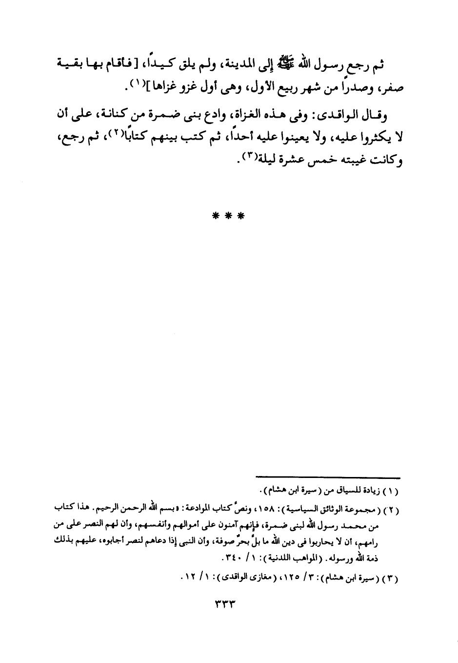 (مجموعة الوثائق السياسية) : 158، ونصّ كتاب الموادعة: «بسم اللَّه الرحمن الرحيم. هذا كتاب من محمد رسول اللَّه لبني ضمرة، فإنّهم آمنون على أموالهم وأنفسهم، وأن لهم النصر على من رامهم، أن لا يحاربوا في دين اللَّه ما بلّ بحر صوفة، وأن النبي إذا دعاهم لنصر أجابوه، عليهم بذلك ذمة اللَّه ورسوله. (المواهب اللدنية) : 1/ 340.