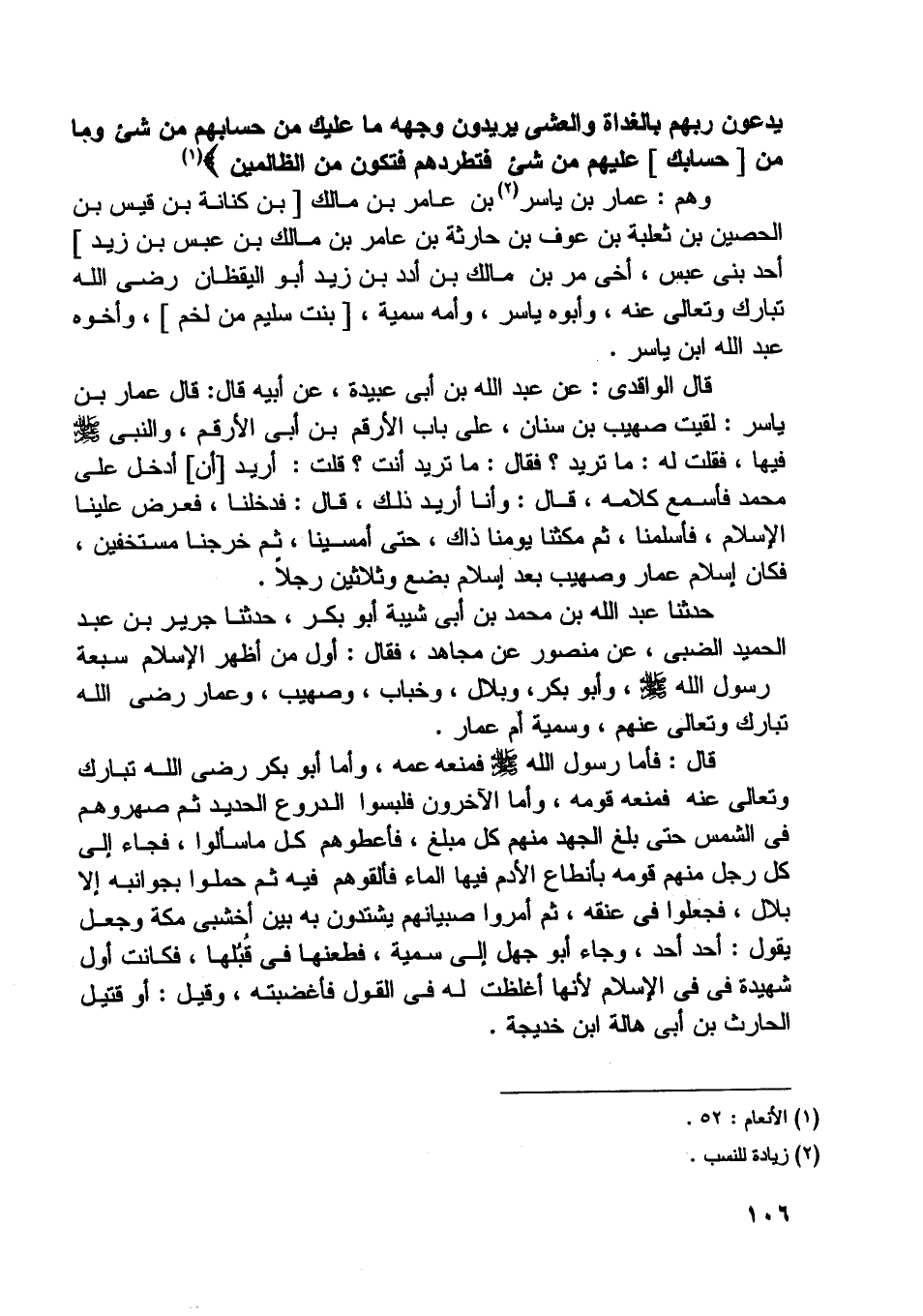يَدْعُونَ رَبَّهُمْ بِالْغَداةِ وَالْعَشِيِّ يُرِيدُونَ وَجْهَهُ ما عَلَيْكَ مِنْ حِسابِهِمْ مِنْ شَيْءٍ وَما مِنْ [حِسابِكَ] عَلَيْهِمْ مِنْ شَيْءٍ فَتَطْرُدَهُمْ فَتَكُونَ مِنَ الظَّالِمِينَ [ (1) ] وهم: عمار بن ياسر [ (2) ] بن عامر بن مالك [بن كنانة بن قيس بن الحصين بن ثعلبة بن عوف بن حارثة بن عامر بن مالك بن عبس بن زيد] أحد بنى عبس، أخى مر بن مالك بن أدد بن زيد أبو اليقظان رضى اللَّه تبارك وتعالى عنه، وأبوه ياسر، وأمه سمية، [بنت سليم من لخم] ، وأخوه عبد اللَّه ابن ياسر.