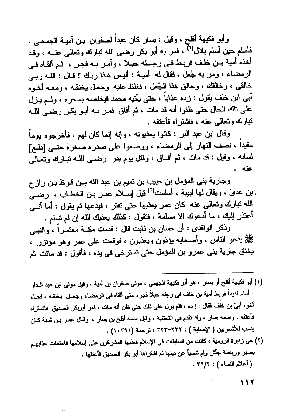 وأبو فكيهة أفلح، وقيل: يسار كان عبدا لصفوان بن أمية الجمحيّ، فأسلم حين أسلم بلال [ (1) ] ، فمر به أبو بكر رضى اللَّه تبارك وتعالى عنه، وقد أخذه أمية بن خلف فربط في رجله حبلا، وأمر به فجر، ثم ألقاه في الرمضاء، ومر به جعل، فقال له أمية: أليس هذا ربك؟ قال: اللَّه ربى خالقي، وخالقك، وخالق هذا الجعل، فغلظ عليه وجعل يخنقه، ومعه أخوه أبى ابن خلف يقول: زده عذابا، حتى يأتيه محمد فيخلصه بسحره، ولم يزل على تلك الحال حتى ظنوا أنه قد مات، ثم أفاق فمر به أبو بكر رضى اللَّه تبارك وتعالى عنه، فاشتراه فأعتقه.