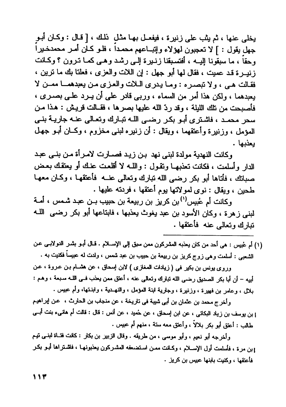 يخلى عنها، ثم يثب على زنيرة، فيفعل بها مثل ذلك، [قال: وكان أبو جهل يقول:] لا تعجبون لهؤلاء واتباعهم محمدا، فلو كان أمر محمد خيرا وحقا، ما سبقونا إليه، أفتسبقنا زنيرة إلى رشد وهي كما ترون؟ وكانت زنيرة قد عميت، فقال لها أبو جهل: إن اللات والعزى، بك ما ترين، فقالت هي، ولا تبصره: وما يدرى اللات والعزى من يعبدهما ممن لا يعبدهما، ولكن هذا أمر من السماء، وربى قادر على أن يرد على بصرى، فأصبحت من تلك الليلة، وقد ردّ اللَّه عليها بصرها، فقالت قريش: هذا من سحر محمد، فاشترى أبو بكر رضى اللَّه تبارك وتعالى عنه جارية بنى المؤمل، وزنيرة وأعتقهما، ويقال: أن زنيرة لبني مخزوم، وكان أبو جهل يعذبها.