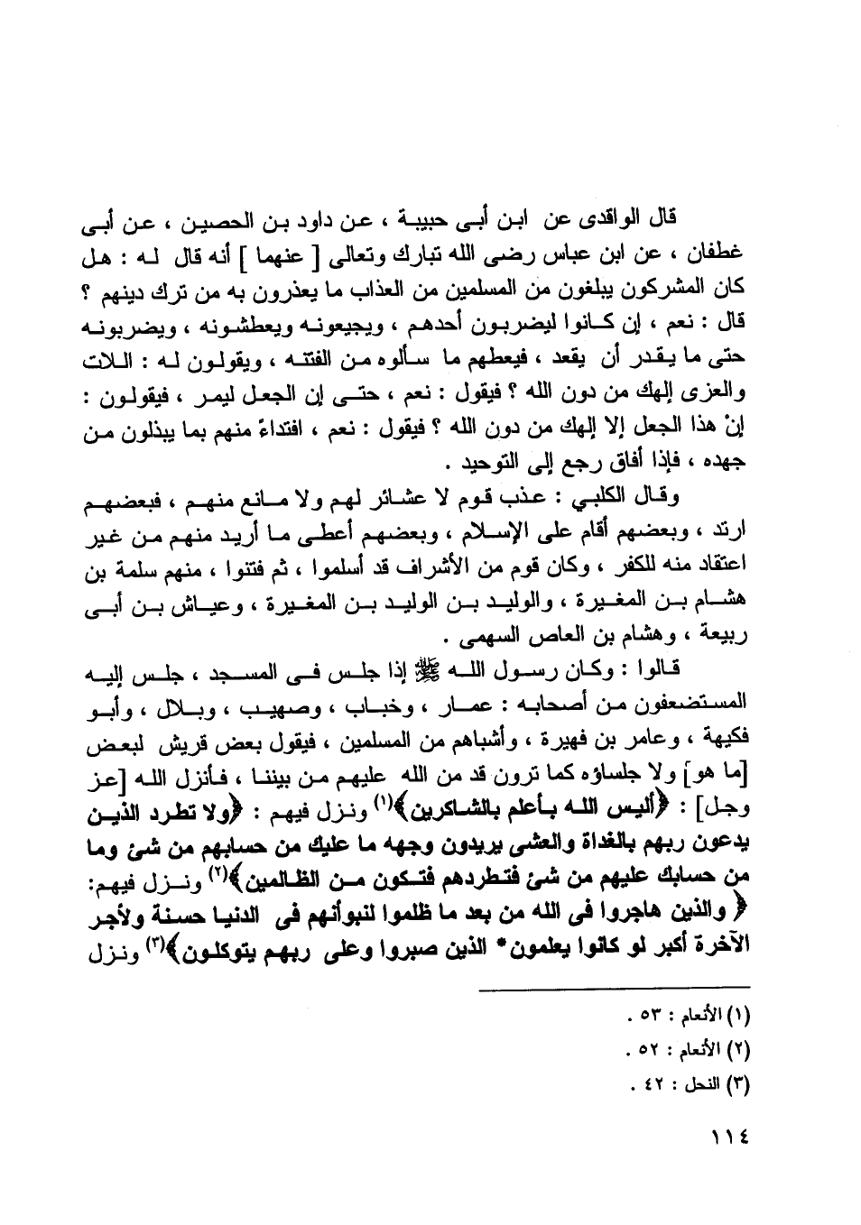 قالوا: وكان رسول اللَّه صلّى اللَّه عليه وسلّم إذا جلس في المسجد، جلس إليه المستضعفون من أصحابه: عمار، وخباب، وصهيب، وبلال، وأبو فكيهة، وعامر بن فهيرة، وأشباههم من المسلمين، فيقول بعض قريش لبعض [ما هو] ولا جلساؤه كما ترون قد من اللَّه عليهم من بيننا، فأنزل اللَّه [عز وجل] : أَلَيْسَ اللَّهُ بِأَعْلَمَ بِالشَّاكِرِينَ [ (1) ] ونزل فيهم: وَلا تَطْرُدِ الَّذِينَ يَدْعُونَ رَبَّهُمْ بِالْغَداةِ وَالْعَشِيِّ يُرِيدُونَ وَجْهَهُ ما عَلَيْكَ مِنْ حِسابِهِمْ مِنْ شَيْءٍ وَما مِنْ حِسابِكَ عَلَيْهِمْ مِنْ شَيْءٍ فَتَطْرُدَهُمْ فَتَكُونَ مِنَ الظَّالِمِينَ [ (2) ] ونزل فيهم: