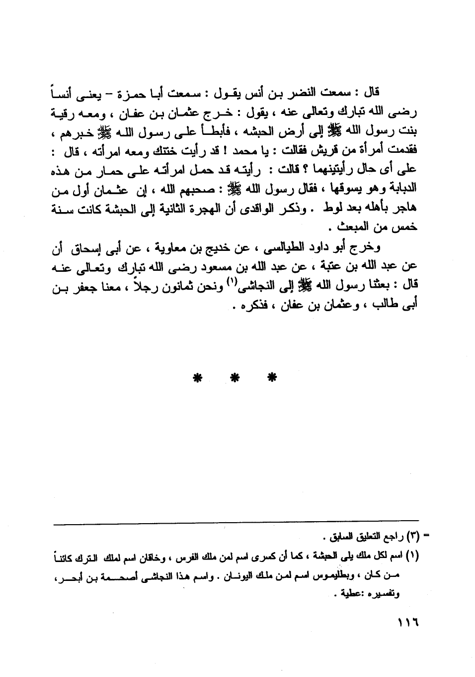 قال: سمعت النضر بن أنس يقول: سمعت أبا حمزة- يعنى أنسا رضي اللَّه تبارك وتعالى عنه، يقول: خرج عثمان بن عفان، ومعه رقية بنت رسول اللَّه صلّى اللَّه عليه وسلّم إلى أرض الحبشة، فأبطأ على رسول اللَّه صلّى اللَّه عليه وسلّم خبرهم، فقدمت امرأة من قريش فقالت: يا محمد! قد رأيت ختنك ومعه امرأته، قال: