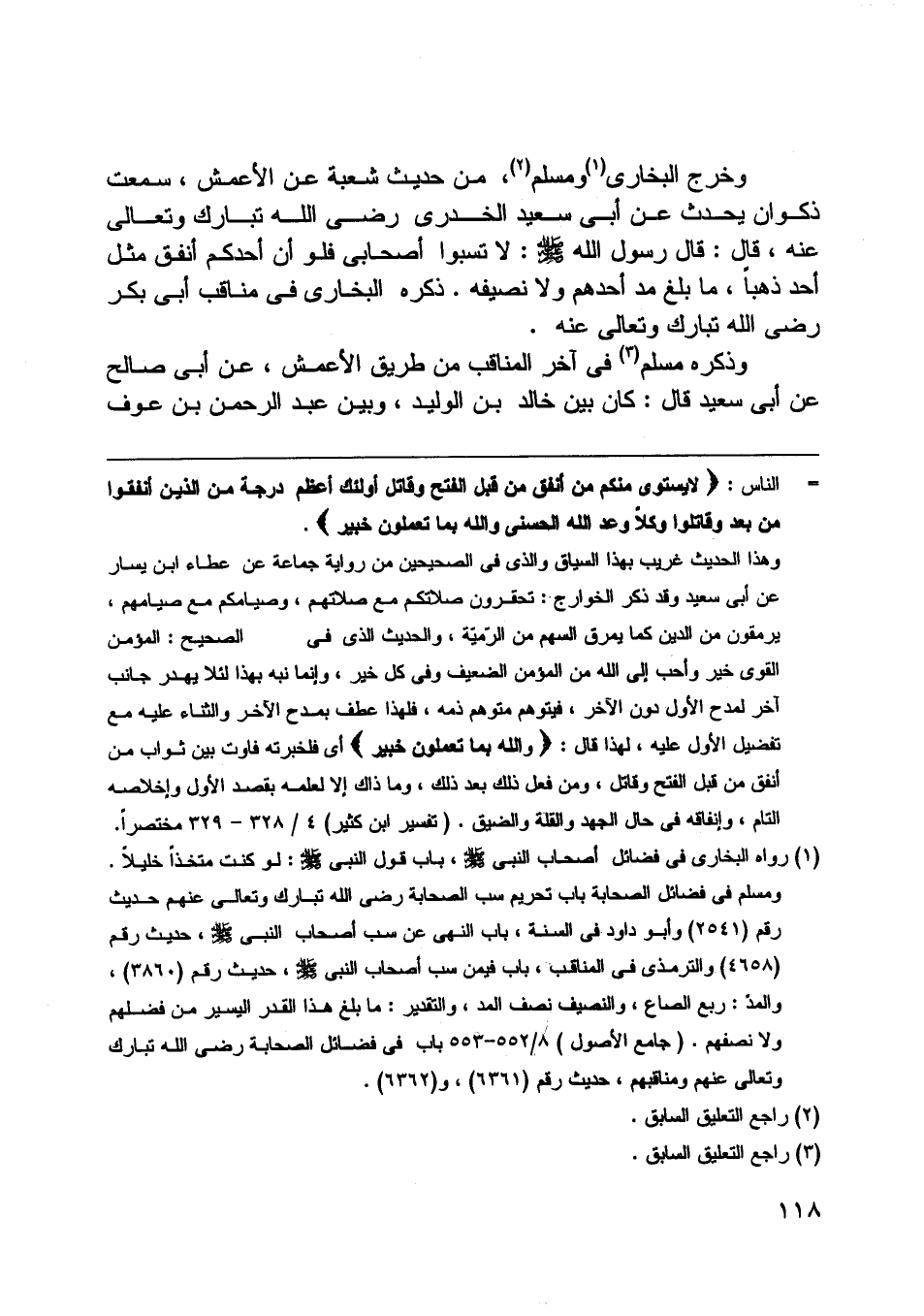 وخرج البخاري [ (1) ] ومسلم [ (2) ] ، من حديث شعبة عن الأعمش، سمعت ذكوان يحدث عن أبى سعيد الخدريّ رضي اللَّه تبارك وتعالى عنه، قال: قال رسول اللَّه صلّى اللَّه عليه وسلّم: لا تسبوا أصحابى فلو أن أحدكم أنفق مثل أحد ذهبا، ما بلغ مد أحدهم ولا نصيفه. ذكره البخاري في مناقب أبى بكر رضي اللَّه تبارك وتعالى عنه.