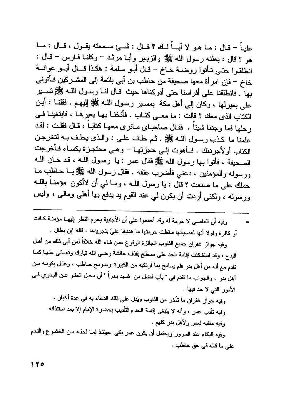 انطلقوا حتى تأتوا روضة خاخ- قال أبو سلمة: هكذا قال أبو عوانة خاخ- فإن امرأة معها صحيفة من حاطب بن أبى بلتعة إلى المشركين فأتوني بها. فانطلقنا على أفراسنا حتى أدركناها حيث قال لنا رسول اللَّه صلّى اللَّه عليه وسلّم تسير على بعير لها، وكان إلى أهل مكة بمسير رسول اللَّه صلّى اللَّه عليه وسلّم إليهم. فقلنا: أين الكتاب الّذي معك؟ قالت: ما معى كتاب. فأنخنا بها بعيرها، فابتغينا في رحلها فما وجدنا شيئا. فقال صاحباي ما نرى معها كتابا، قال فقلت: لقد علمنا ما كذب رسول اللَّه صلّى اللَّه عليه وسلّم. ثم حلف على: والّذي يحلف به لتخرجن الكتاب أو لأجردنك. فأهوت إلى حجزتها- وهي محتجزة بكساء فأخرجت الصحيفة، فأتوا بها رسول اللَّه صلّى اللَّه عليه وسلّم فقال عمر: يا رسول اللَّه، قد خان اللَّه ورسوله والمؤمنين، دعني فأضرب عنقه.