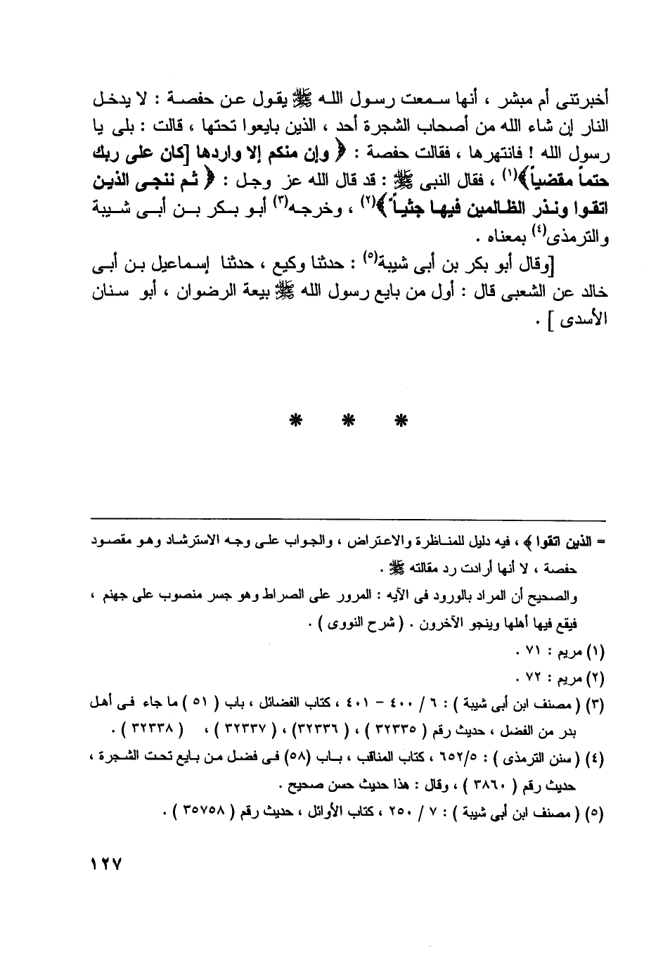 أخبرتنى أم مبشر، أنها سمعت رسول اللَّه صلّى اللَّه عليه وسلّم يقول عن حفصة: لا يدخل النار إن شاء اللَّه من أصحاب الشجرة أحد، الذين بايعوا تحتها، قالت: بلى يا رسول اللَّه! فانتهرها، فقالت حفصة: وَإِنْ مِنْكُمْ إِلَّا وارِدُها [كانَ عَلى رَبِّكَ حَتْماً مَقْضِيًّا [ (1) ] ، فقال النبي صلّى اللَّه عليه وسلّم: قد قال اللَّه عز وجل: ثُمَّ نُنَجِّي الَّذِينَ اتَّقَوْا وَنَذَرُ الظَّالِمِينَ فِيها جِثِيًّا [ (2) ] ، وخرجه [ (3) ] أبو بكر بن أبى شيبة والترمذي [ (4) ] بمعناه.