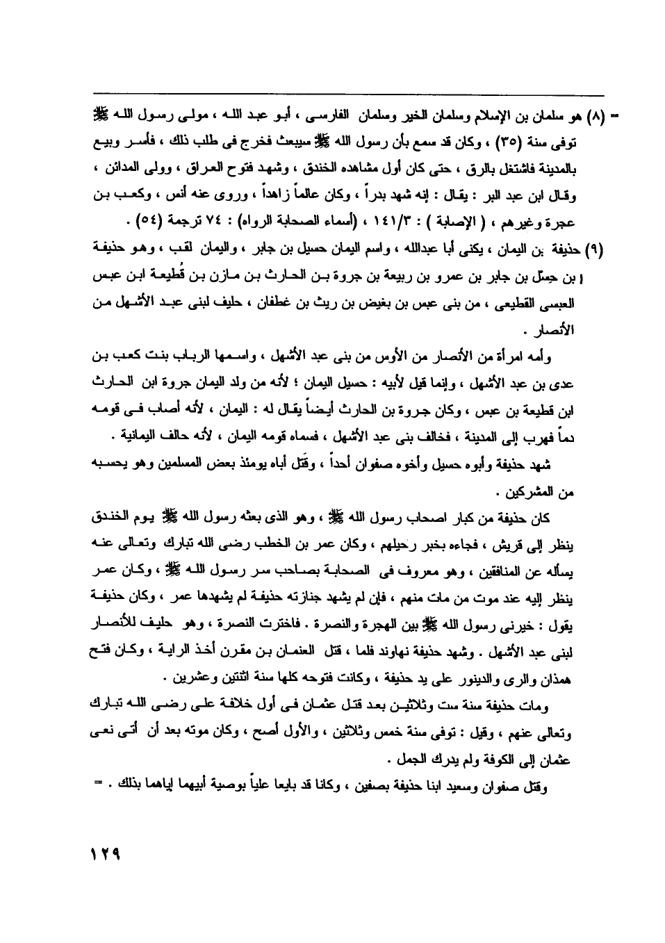[ (2) ] حذيفة بن اليمان، يكنى أبا عبد اللَّه، واسم اليمان حسيل بن جابر، واليمان لقب، وهو حذيفة بن حسل بن جابر بن عمرو بن ربيعة بن جروة بن الحارث بن مازن بن قطيعة ابن عبس العبسيّ القطيعي، من بنى عبس بن بغيض بن ريث بن غطفان، حليف لبني عبد الأشهل من الأنصار.