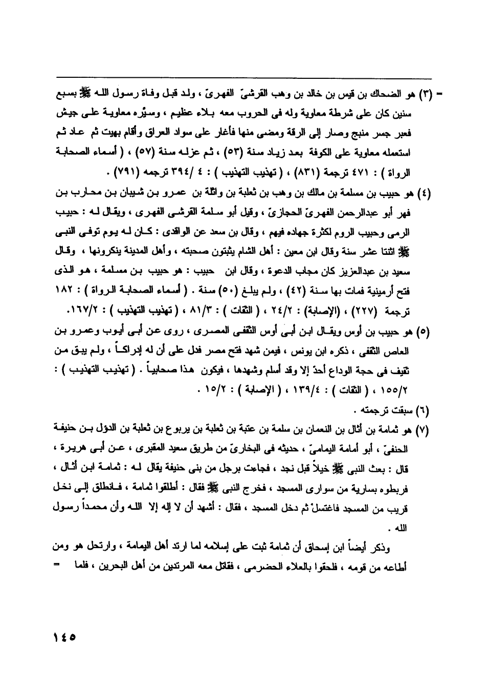 [ (7) ] هو ثمامة بن أثال بن النعمان بن سلمة بن عتبة بن ثعلبة بن يربوع بن ثعلبة بن الدؤل بن حنيفة الحنفىّ، أبو أمامة اليمامىّ، حديثه في البخاريّ من طريق سعيد المقبري، عن أبى هريرة، قال: بعث النبي صلّى اللَّه عليه وسلّم خيلا قبل نجد، فجاءت برجل من بنى حنيفة يقال له: ثمامة ابن أثال، فربطوه بسارية من سواري المسجد، فخرج النبي صلّى اللَّه عليه وسلّم فقال: أطلقوا ثمامة، فانطلق إلى نخل قريب من المسجد فاغتسل ثم دخل المسجد، فقال: أشهد أن لا إله إلا اللَّه وأن محمدا رسول اللَّه.