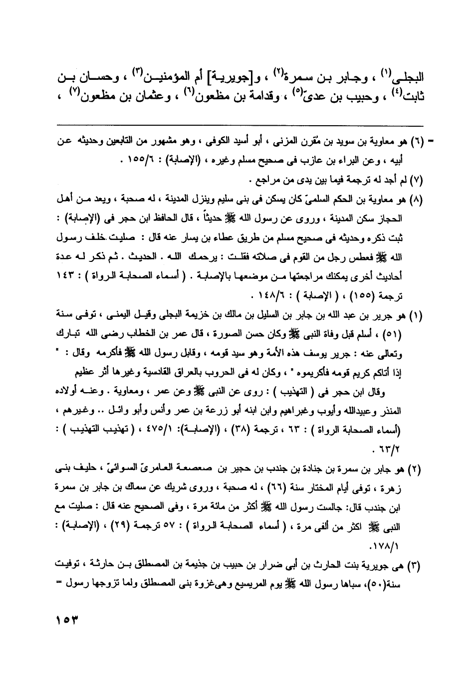 [ (3) ] هي جويرية بنت الحارث بن أبى ضرار بن حبيب بن جذيمة بن المصطلق بن حارثة، توفيت سنة (50) ، سباها رسول اللَّه صلّى اللَّه عليه وسلّم يوم المريسيع وهي غزوة بنى المصطلق ولما تزوجها رسول