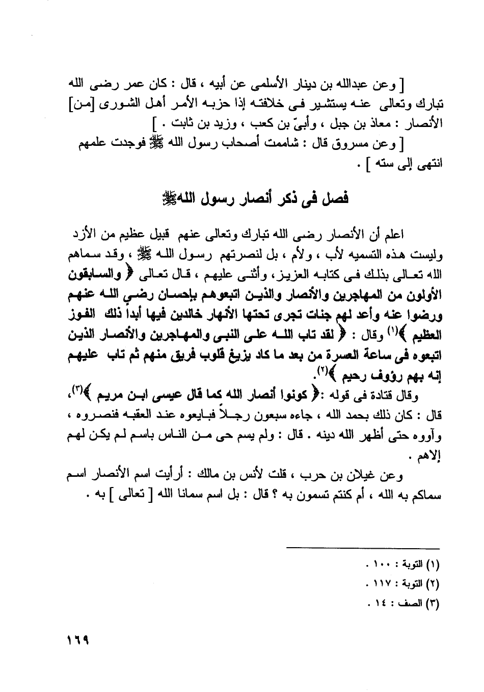 اعلم أن الأنصار رضى اللَّه تبارك وتعالى عنهم قبيل عظيم من الأزد وليست هذه التسمية لأب، ولأم، بل لنصرتهم رسول اللَّه صلّى اللَّه عليه وسلّم، وقد سماهم اللَّه تعالى بذلك في كتابه العزيز، وأثنى عليهم، قال تعالى وَالسَّابِقُونَ الْأَوَّلُونَ مِنَ الْمُهاجِرِينَ وَالْأَنْصارِ وَالَّذِينَ اتَّبَعُوهُمْ بِإِحْسانٍ رَضِيَ اللَّهُ عَنْهُمْ وَرَضُوا عَنْهُ وَأَعَدَّ لَهُمْ جَنَّاتٍ تَجْرِي تَحْتَهَا الْأَنْهارُ خالِدِينَ فِيها أَبَداً ذلِكَ الْفَوْزُ الْعَظِيمُ [ (1) ] وقال: لَقَدْ تابَ اللَّهُ عَلَى النَّبِيِّ وَالْمُهاجِرِينَ وَالْأَنْصارِ الَّذِينَ اتَّبَعُوهُ فِي ساعَةِ الْعُسْرَةِ مِنْ بَعْدِ ما كادَ يَزِيغُ قُلُوبُ فَرِيقٍ مِنْهُمْ ثُمَّ تابَ عَلَيْهِمْ إِنَّهُ بِهِمْ رَؤُفٌ رَحِيمٌ [ (2) ] .