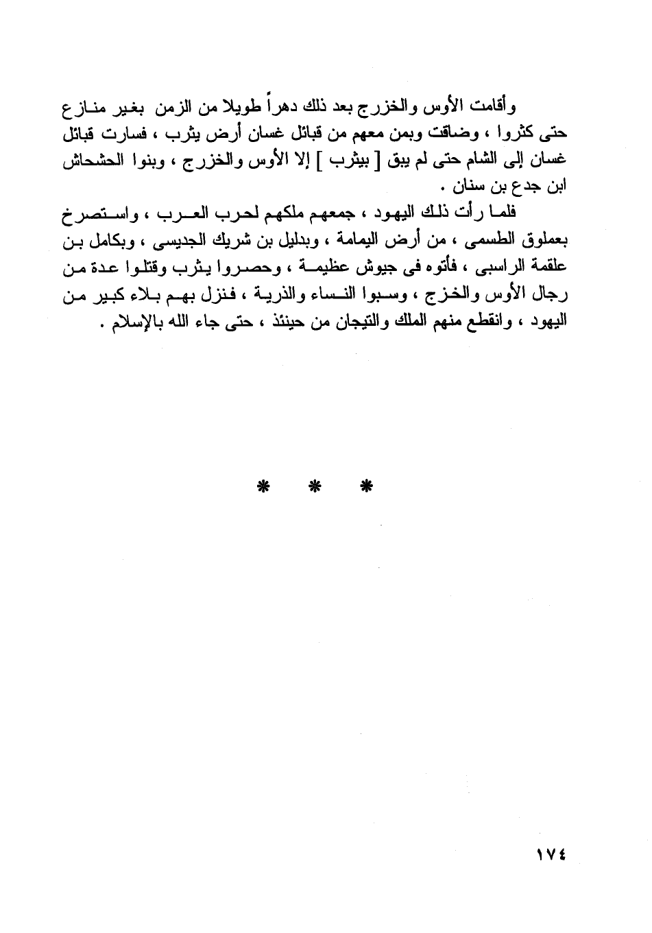 وأقامت الأوس والخزرج بعد ذلك دهرا طويلا من الزمن بغير منازع حتى كثروا، وضاقت وبمن معهم من قبائل غسان أرض يثرب، فسارت قبائل غسان إلى الشام حتى لم يبق [بيثرب] إلا الأوس والخزرج، وبنو الحشحاش ابن جدع بن سنان.