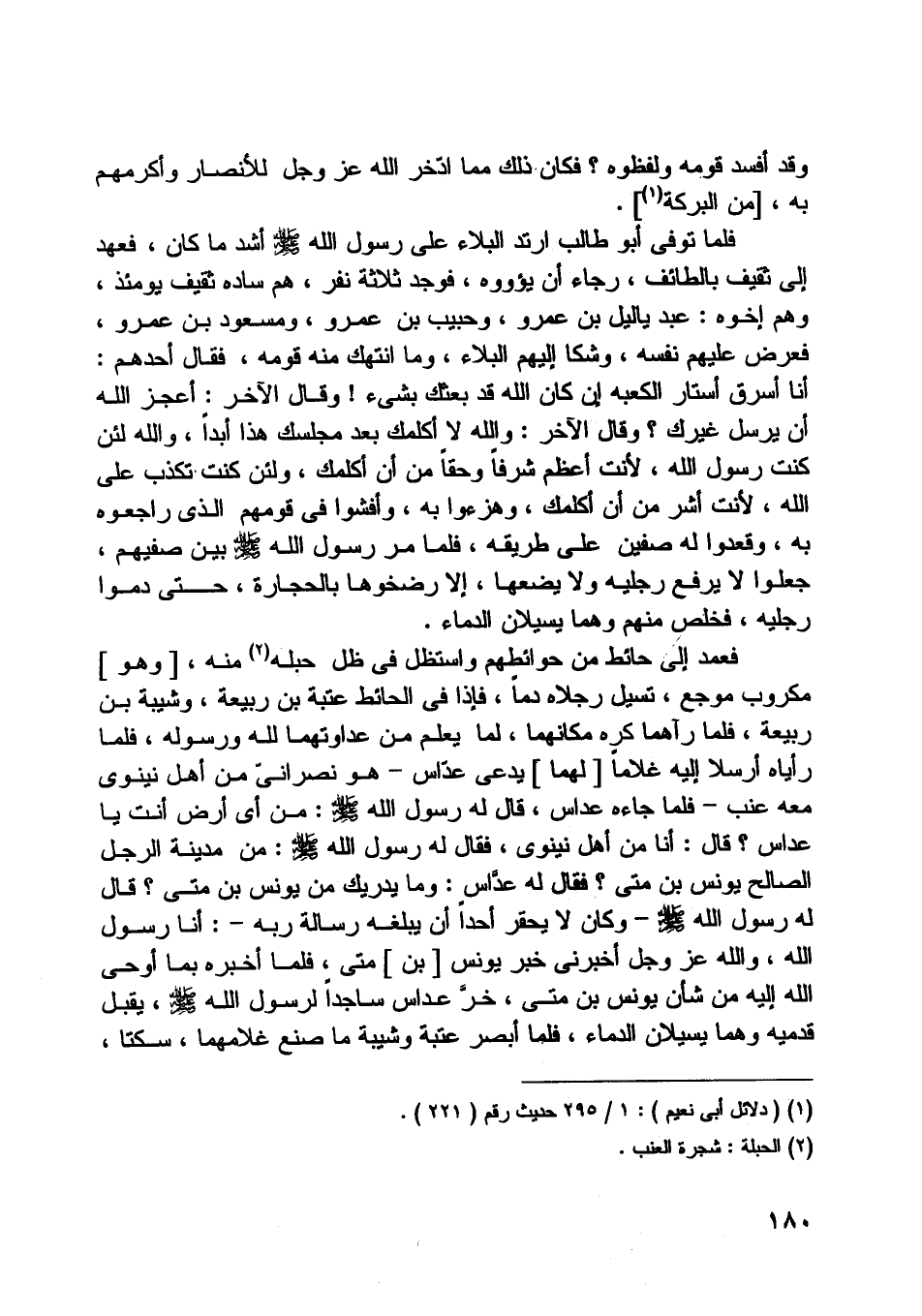 فعمد إلى حائط من حوائطهم واستظل في ظل حبله [ (2) ] منه، [وهو] مكروب موجع، تسيل رجلاه دما، فإذا في الحائط عتبة بن ربيعة، وشيبة بن ربيعة، فلما رآهما كره مكانهما، لما يعلم من عداوتهما للَّه ورسوله،