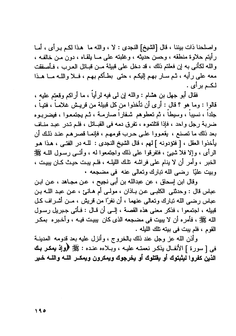 وأصلحنا ذات بيننا، قال [الشيخ] النجدي: لا، واللَّه ما هذا لكم برأي، أما رأيتم حلاوة منطقه، وحسن حديثه، وغلبته على ما يلقاه، دون من خالفه، واللَّه لكأنّي به إن فعلتم ذلك، قد دخل على قبيلة من قبائل العرب، فأصفقت معه على رأيه، ثم سار بهم إليكم، حتى بطأكم بهم، فلا واللَّه ما هذا لكم برأي.