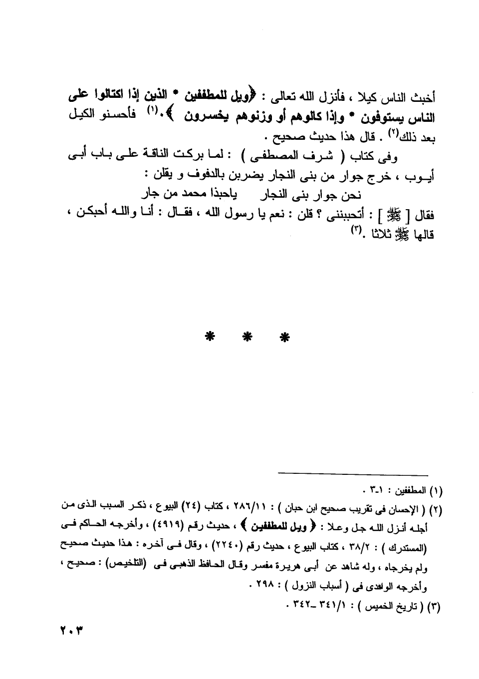 [ (2) ] (الإحسان في تقريب صحيح ابن حبان) : 11/ 286، كتاب (24) البيوع، ذكر السبب الّذي من أجله أنزل اللَّه جل وعلا: وَيْلٌ لِلْمُطَفِّفِينَ، حديث رقم (4919) ، وأخرجه الحاكم في (المستدرك) : 2/ 38، كتاب البيوع، حديث رقم (2240) ، وقال في آخره: هذا حديث صحيح ولم يخرجاه، وله شاهد عن أبى هريرة مفسر وقال الحافظ الذهبي في (التلخيص) : صحيح، وأخرجه الواقدي في (أسباب النزول) : 298.