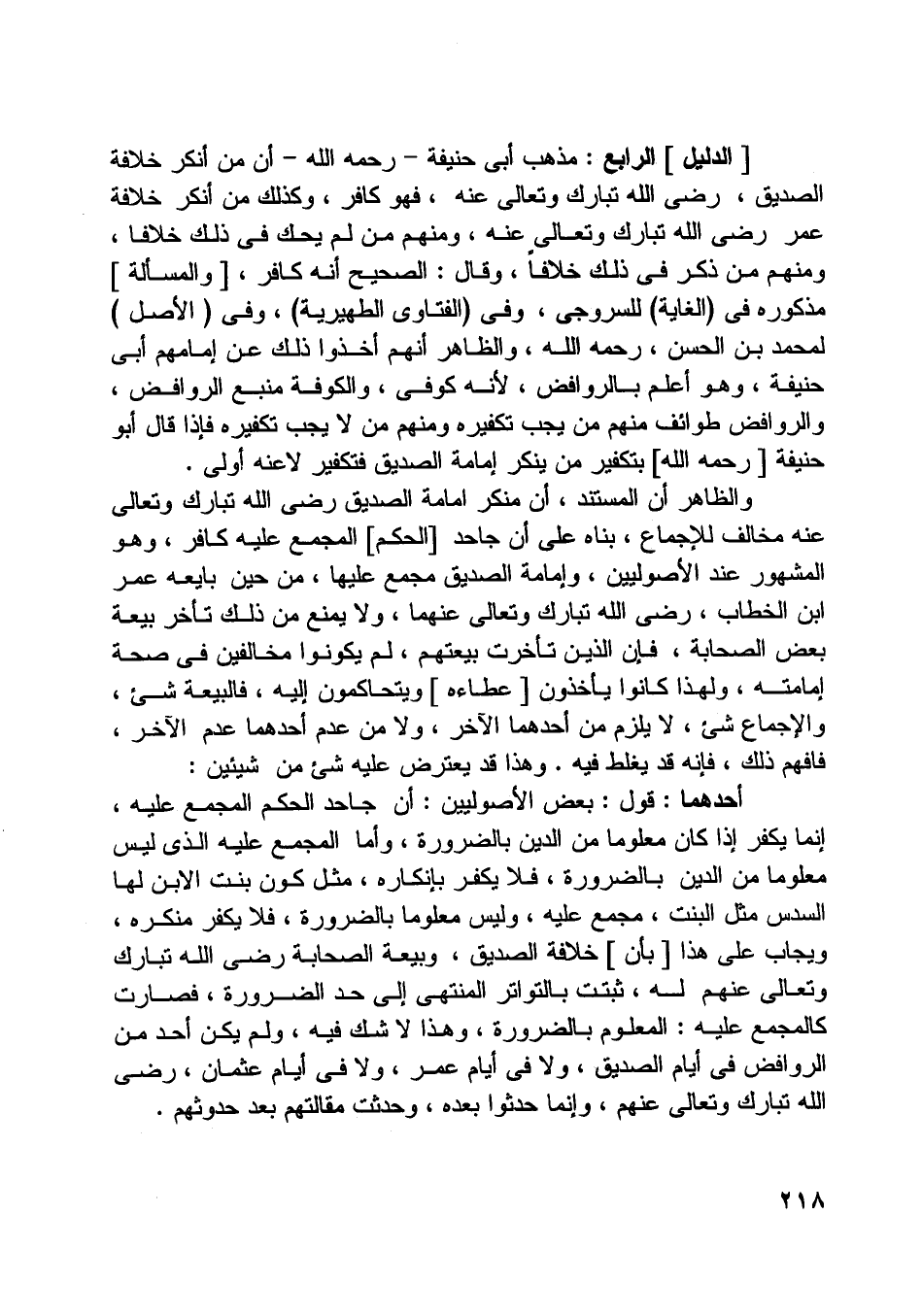 [الدليل] الرابع: مذهب أبى حنيفة- رحمه اللَّه- أن من أنكر خلافة الصديق، رضى اللَّه تبارك وتعالى عنه، فهو كافر، وكذلك من أنكر خلافة عمر رضى اللَّه تبارك وتعالى عنه، ومنهم من لم يحك في ذلك خلافا، ومنهم من ذكر في ذلك خلافا، وقال: الصحيح أنه كافر، [والمسألة] مذكورة في (الغاية) للسروجى، وفي (الفتاوى الطهيرية) ، وفي (الأصل) لمحمد بن الحسن، رحمه اللَّه، والظاهر أنهم أخذوا ذلك عن إمامهم أبى حنيفة، وهو أعلم بالروافض، لأنه كوفى، والكوفة منبع الروافض، والروافض طوائف منهم من يجب تكفيره ومنهم من لا يجب تكفيره فإذا قال أبو حنيفة [رحمه اللَّه] بتكفير من ينكر إمامة الصديق فتكفير لا عنه أولى.