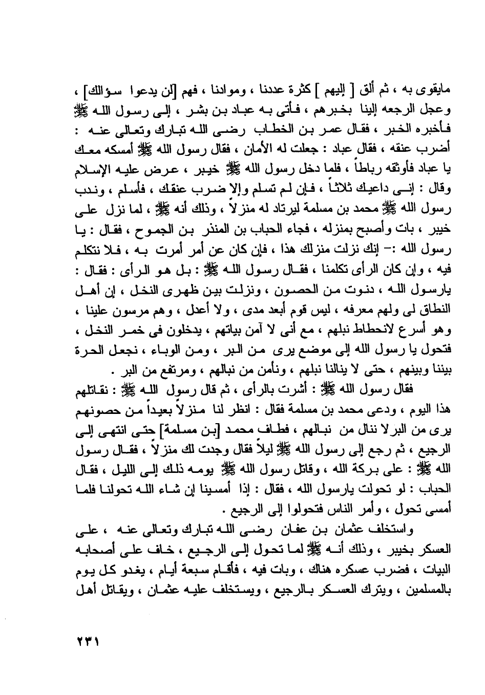 أضرب عنقه، فقال عباد: جعلت له الأمان، فقال رسول اللَّه صلّى اللَّه عليه وسلّم أمسكه معك يا عباد فأوثقه رباطا، فلما دخل رسول اللَّه صلّى اللَّه عليه وسلّم خيبر، عرض عليه الإسلام وقال: إني داعيك ثلاثا، فإن لم تسلم وإلا ضرب عنقك، فأسلم، وندب رسول اللَّه صلّى اللَّه عليه وسلّم محمد بن مسلمة ليرتاد له منزلا، وذلك أنه صلّى اللَّه عليه وسلّم، لما نزل على خيبر، بات وأصبح بمنزله، فجاء الحباب بن المنذر بن الجموح، فقال: يا رسول اللَّه: - إنك نزلت منزلك هذا، فإن كان عن أمر أمرت به، فلا نتكلم فيه، وإن كان الرأى تكلمنا، فقال رسول اللَّه صلّى اللَّه عليه وسلّم: بل هو الرأى: فقال: