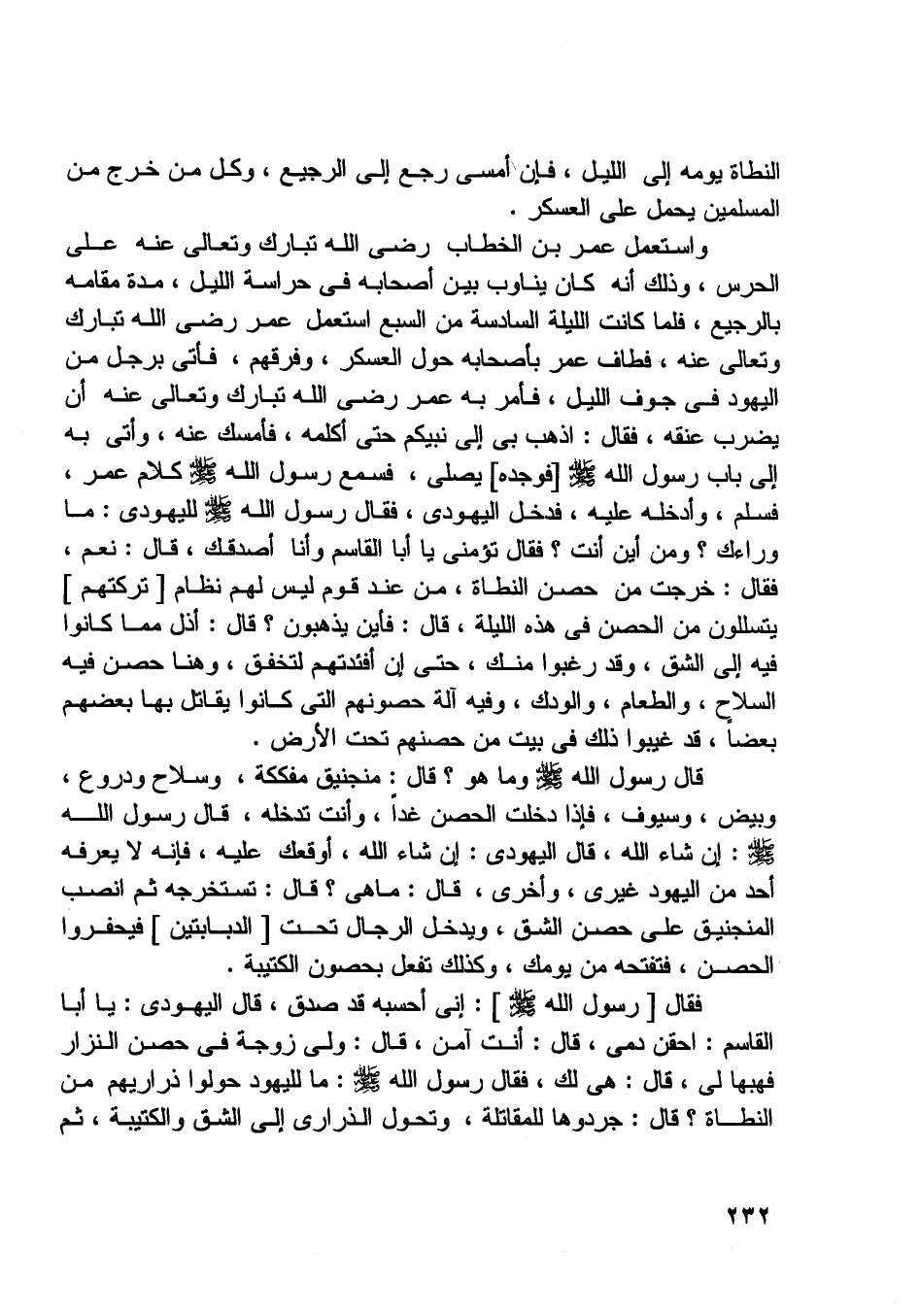 فقال [رسول اللَّه صلّى اللَّه عليه وسلّم] : إني أحسبه قد صدق، قال اليهودي: يا أبا القاسم: احقن دمي، قال: أنت آمن، قال: ولي زوجة في حصن النزار فهبها لي، قال: هي لك، فقال رسول اللَّه صلّى اللَّه عليه وسلّم: ما لليهود حولوا ذراريهم من النطاة؟ قال: جردوها للمقاتلة،