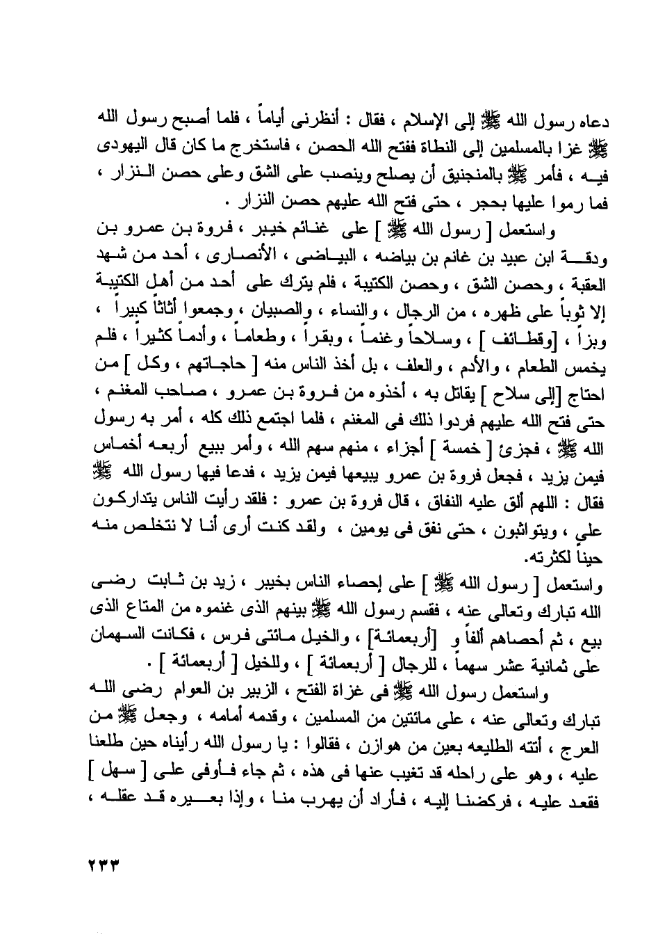 واستعمل [رسول اللَّه صلّى اللَّه عليه وسلّم] على غنائم خيبر، فروة بن عمرو بن ودقة ابن عبيد بن غانم بن بياضه، البياضي، الأنصاري، أحد من شهد العقبة، وحصن الشق، وحصن الكتيبة، فلم يترك على أحد من أهل الكتيبة إلا ثوبا على ظهره، من الرجال، والنساء، والصبيان، وجمعوا أثاثا كبيرا، وبزا، [وقطائف] ، وسلاحا وغنما، وبقرا، وطعاما، وأدما كثيرا، فلم يخمس الطعام، والأدم، والعلف، بل أخذ الناس منه [حاجاتهم، وكل] من احتاج [إلى سلاح] يقاتل به، أخذوه من فروة بن عمرو، صاحب المغنم، حتى فتح اللَّه عليهم فردوا ذلك في المغنم، فلما اجتمع ذلك كله، أمر به رسول اللَّه صلّى اللَّه عليه وسلّم فجزئ [خمسة] أجزاء، منهم سهم اللَّه، وأمر ببيع أربعة أخماس فيمن يزيد، فجعل فروة بن عمرو يبيعها فيمن يزيد،