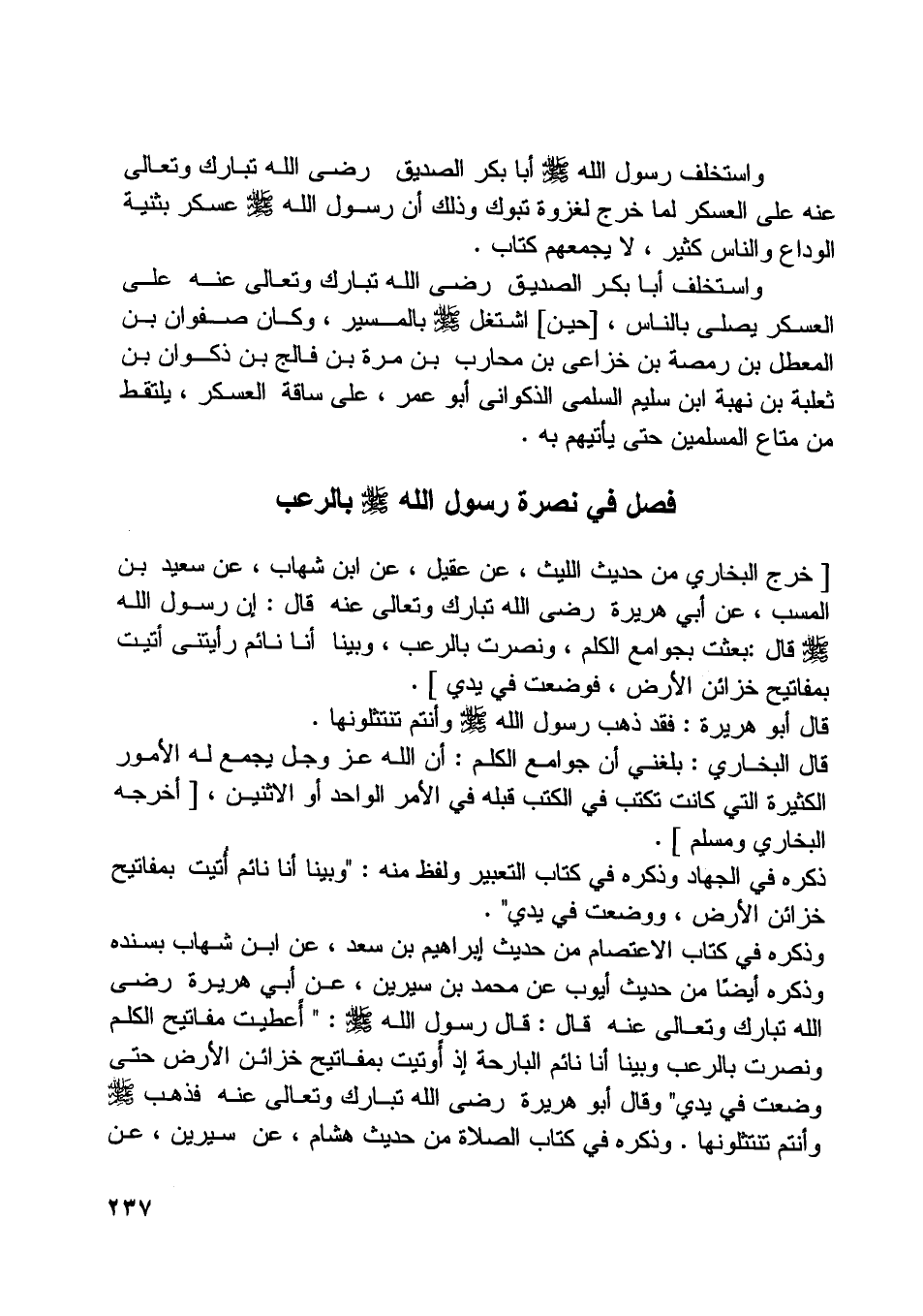 وذكره في كتاب الاعتصام من حديث إبراهيم بن سعد، عن ابن شهاب بسنده وذكره أيضا من حديث أيوب عن محمد بن سيرين، عن أبي هريرة رضى اللَّه تبارك وتعالى عنه قال: قال رسول اللَّه صلّى اللَّه عليه وسلّم: «أعطيت مفاتيح الكلم ونصرت بالرعب وبينا أنا نائم البارحة إذا أوتيت بمفاتيح خزائن الأرض حتى وضعت في يدي» وقال أبو هريرة رضى اللَّه تبارك وتعالى عنه فذهب صلّى اللَّه عليه وسلّم وأنتم تنتثلونها. وذكره في كتاب الصلاة من حديث هشام، عن سيرين، عن