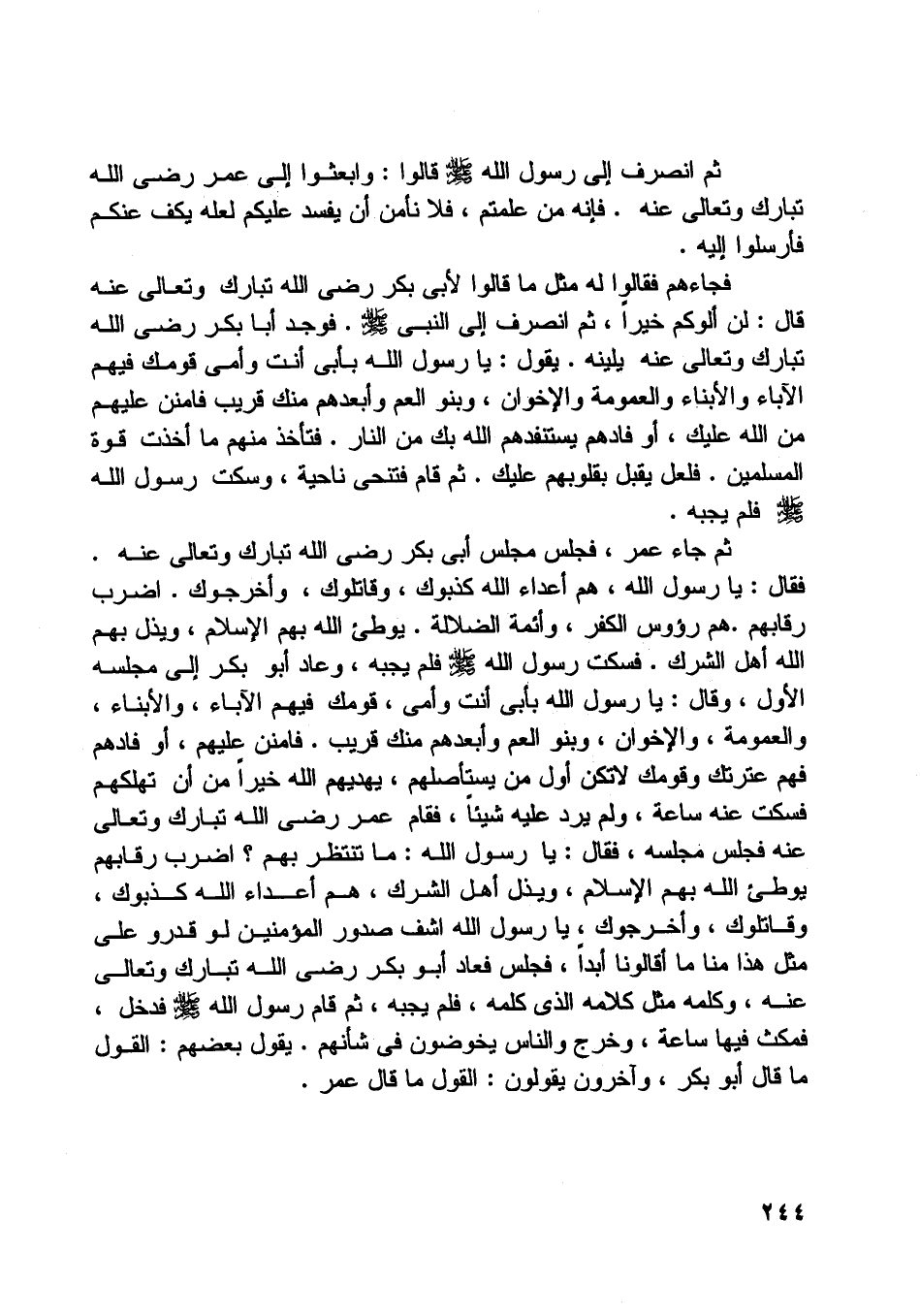 فقال: يا رسول اللَّه، هم أعداء اللَّه كذبوك، وقاتلوك، وأخرجوك. اضرب رقابهم. هم رءوس الكفر، وأئمة الضلالة. يوطئ اللَّه بهم الإسلام، ويذل بهم اللَّه أهل الشرك. فسكت رسول اللَّه صلّى اللَّه عليه وسلّم فلم يجبه، وعاد أبو بكر إلى مجلسه الأول، وقال: يا رسول اللَّه بأبي أنت وأمى، قومك فيهم الآباء، والأبناء، والعمومة، والإخوان، وبنو العم وأبعدهم منك قريب. فامنن عليهم، أو فادهم فهم عترتك وقومك لا تكن أول من يستأصلهم، يهديهم اللَّه خيرا من أن تهلكهم فسكت عنه ساعة، ولم يرد عليه شيئا، فقام عمر رضى اللَّه تبارك وتعالى عنه فجلس مجلسه، فقال: يا رسول اللَّه: ما تنتظر بهم؟ اضرب رقابهم يوطئ اللَّه بهم الإسلام، ويذل أهل الشرك، هم أعداء اللَّه كذبوك، وقاتلوك، وأخرجوك، يا رسول اللَّه اشف صدور المؤمنين لو قدروا على مثل هذا منا ما أقالونا أبدا، فجلس فعاد أبو بكر رضى اللَّه تبارك وتعالى عنه، وكلمه مثل كلامه الّذي كلمه، فلم يجبه، ثم قام رسول اللَّه صلّى اللَّه عليه وسلّم فدخل، فمكث فيها ساعة، وخرج والناس يخوضون في شأنهم. يقول بعضهم: القول ما قال أبو بكر، وآخرون يقولون: القول ما قال عمر.