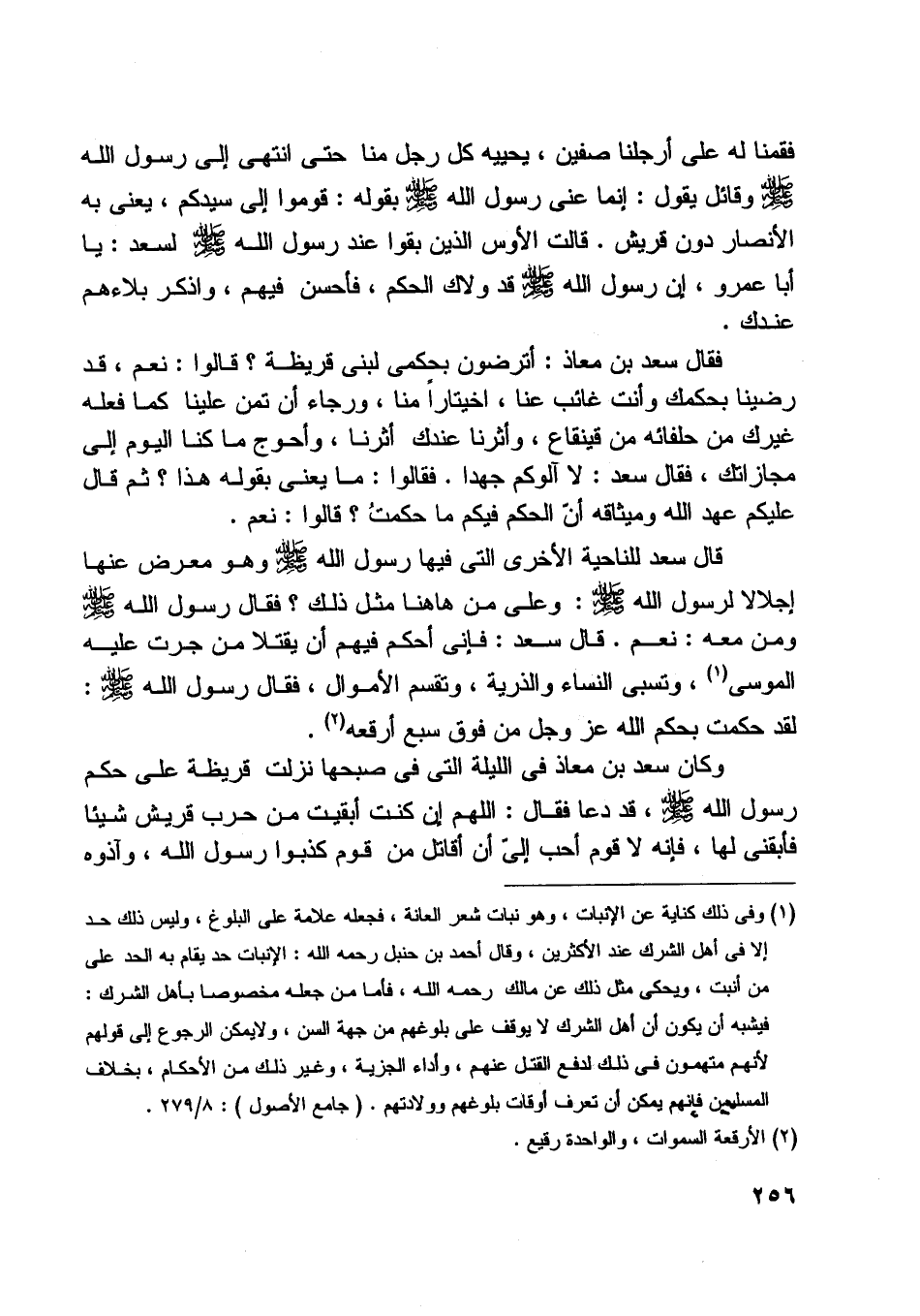 قال سعد للناحية الأخرى التي فيها رسول اللَّه صلّى اللَّه عليه وسلّم وهو معرض عنها إجلالا لرسول اللَّه صلّى اللَّه عليه وسلّم: وعلى من هاهنا مثل ذلك؟ فقال رسول اللَّه صلّى اللَّه عليه وسلّم ومن معه: نعم. قال سعد: فإنّي أحكم فيهم أن يقتلا من جرت عليه الموسى [ (1) ] ، وتسبى النساء والذرية، وتقسم الأموال، فقال رسول اللَّه صلّى اللَّه عليه وسلّم: