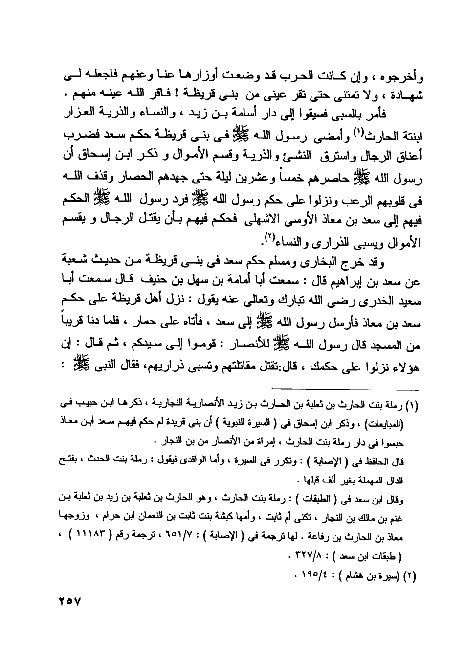 وقد خرج البخاري ومسلم حكم سعد في بنى قريظة من حديث شعبة عن سعد بن إبراهيم قال: سمعت أبا أمامة بن سهل بن حنيف قال سمعت أبا سعيد الخدريّ رضى اللَّه تبارك وتعالى عنه يقول: نزل أهل قريظة على حكم سعد بن معاذ فأرسل رسول اللَّه صلّى اللَّه عليه وسلّم إلى سعد، فأتاه على حمار، فلما دنا قريبا من المسجد قال رسول اللَّه صلّى اللَّه عليه وسلّم للأنصار: قوموا إلى سيدكم، ثم قال: إن هؤلاء نزلوا على حكمك، قال: تقتل مقاتلتهم وتسبى ذراريهم، فقال النبي صلّى اللَّه عليه وسلّم: