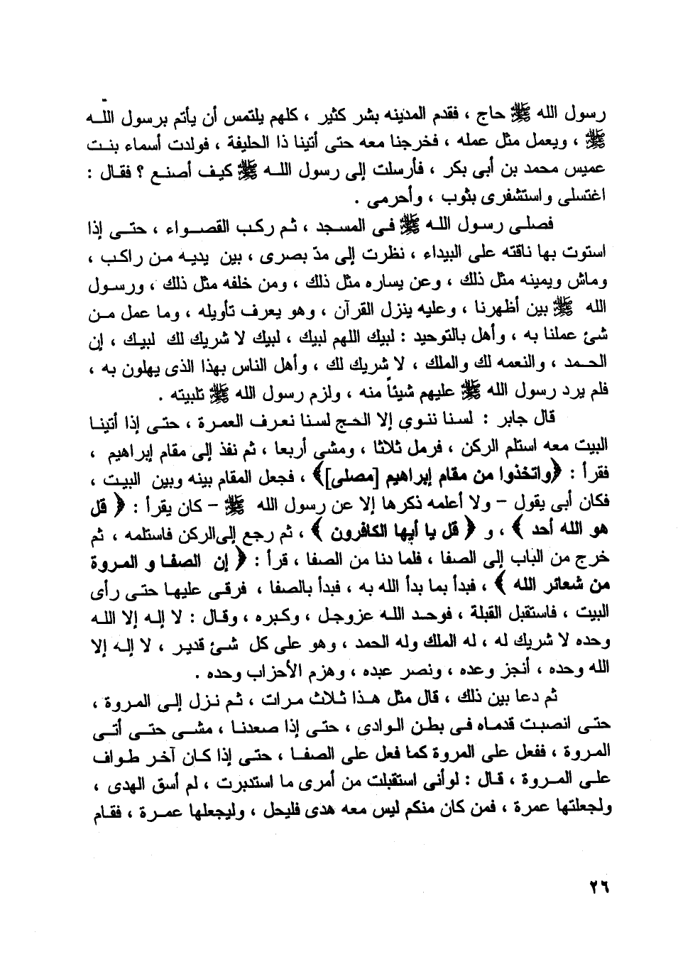 قال جابر: لسنا ننوى إلا الحج لسنا نعرف العمرة، حتى إذا أتينا البيت معه استلم الركن، فرمل ثلاثا، ومشى أربعا، ثم نفذ إلى مقام إبراهيم، فقرأ: وَاتَّخِذُوا مِنْ مَقامِ إِبْراهِيمَ [مُصَلًّى] ، فجعل المقام بينه وبين البيت، فكان أبى يقول- ولا أعلمه ذكرها إلا عن رسول اللَّه صلّى اللَّه عليه وسلّم- كان يقرأ: قُلْ هُوَ اللَّهُ أَحَدٌ، وقُلْ يا أَيُّهَا الْكافِرُونَ، ثم رجع إلى الركن فاستلمه، ثم خرج من الباب إلى الصفا، فلما دنا من الصفا، قرأ: إِنَّ الصَّفا وَالْمَرْوَةَ مِنْ شَعائِرِ اللَّهِ، فبدأ بما بدأ اللَّه به، فبدأ بالصفا، فرقى عليها حتى رأى البيت، فاستقبل القبلة، فوحد اللَّه عز وجل، وكبره، وقال: لا إله إلا اللَّه وحده لا شريك له، له الملك وله الحمد، وهو على كل شيء قدير، لا إله إلا اللَّه وحده، أنجز وعده، ونصر عبده، وهزم الأحزاب وحده.