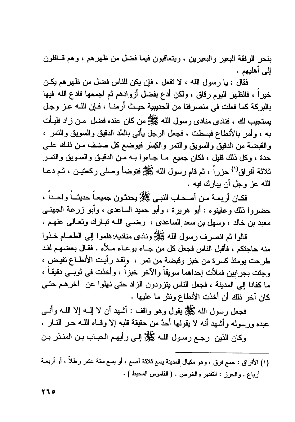 فقال: يا رسول اللَّه، لا تفعل، فإن يكن للناس فضل من ظهرهم يكن خيرا، فالظهر اليوم رقاق، ولكن أدع بفضل أزوادهم ثم اجمعها فادع اللَّه فيها بالبركة كما فعلت في منصرفنا من الحديبيّة حيث أرمنا، فإن اللَّه عز وجل يستجيب لك، فنادى منادى رسول اللَّه صلّى اللَّه عليه وسلّم من كان عنده فضل من زاد فليأت به، وأمر بالأنطاع فبسطت، فجعل الرجل يأتى بالمد الدقيق والسويق والتمر، والقبضة من الدقيق والسويق والتمر والكسر فيوضع كل صنف من ذلك على حدة، وكل ذلك قليل، فكان جميع ما جاءوا به من الدقيق والسويق والتمر ثلاثة أفراق [ (1) ] حزرا، ثم قام رسول اللَّه صلّى اللَّه عليه وسلّم فتوضأ وصلّى ركعتين، ثم دعا اللَّه عز وجل أن يبارك فيه.