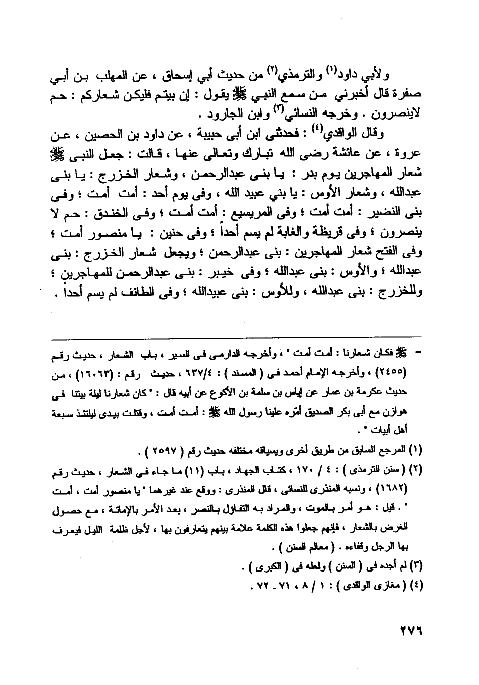 وقال الواقدي [ (4) ] : فحدثني ابن أبى حبيبة، عن داود بن الحصين، عن عروة، عن عائشة رضى اللَّه تبارك وتعالى عنها، قالت: جعل النبي صلّى اللَّه عليه وسلّم شعار المهاجرين يوم بدر: يا بنى عبد الرحمن، وشعار الخزرج: يا بنى عبد اللَّه، وشعار الأوس: يا بني عبيد اللَّه، وفي يوم أحد: أمت أمت، وفي بنى النضير: أمت أمت، وفي المريسيع: أمت أمت، وفي الخندق: حم لا ينصرون، وفي قريظة والغابة لم يسم أحدا، وفي حنين: يا منصور أمت، وفي الفتح شعار المهاجرين: بنى عبد الرحمن، ويجعل شعار الخزرج: بنى عبد اللَّه، والأوس: بنى عبد اللَّه، وفي خيبر: بنى عبد الرحمن للمهاجرين، وللخزرج: بنى عبد اللَّه، وللأوس: بنى عبيد اللَّه، وفي الطائف لم يسم أحدا.