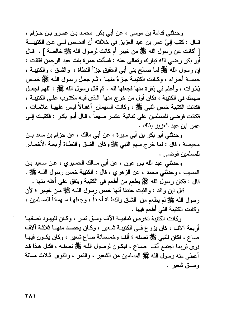 وحدثني قدامة بن موسى، عن أبي بكر محمد بن عمرو بن حزام، قال: كتب إليّ عمر بن عبد العزيز في خلافته أن افحص لي عن الكتيبة [أكانت عن رسول اللَّه صلّى اللَّه عليه وسلّم من خيبر أم كانت لرسول اللَّه صلّى اللَّه عليه وسلّم خالصة] ، قال أبو بكر رضي اللَّه تبارك وتعالى عنه: فسألت عمرة بنت عبد الرحمن فقالت: