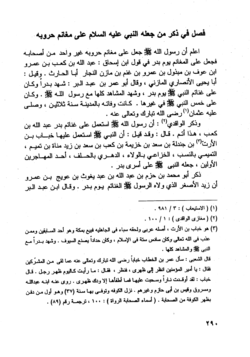 وذكر الواقدي [ (2) ] : أن رسول اللَّه صلّى اللَّه عليه وسلّم استعمل على غنائم بدر عبد اللَّه بن كعب، هذا أتم. قال: وقد قيل: أن النبي صلّى اللَّه عليه وسلّم استعمل عليها خباب بن الأرتّ [ (3) ] بن جندلة بن سعد بن خزيمة بن كعب بن سعد بن زيد مناة بن تميم، التميمي بالنسب، الخزاعي بالولاء، الدهري بالحلف، أحد المهاجرين الأولين، جعله النبي صلّى اللَّه عليه وسلّم على أسرى بدر.