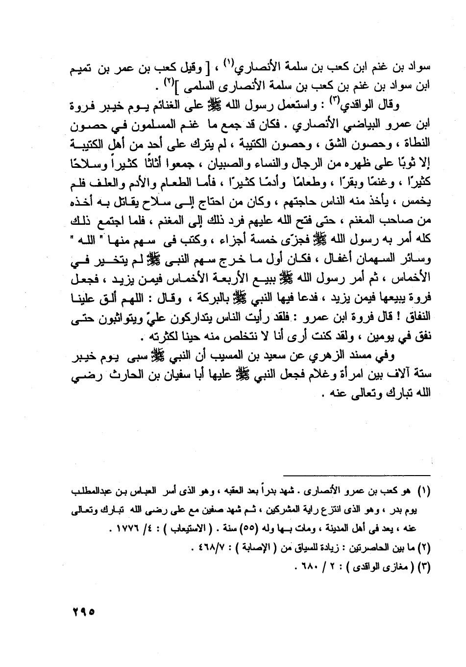 وقال الواقدي [ (3) ] : واستعمل رسول اللَّه صلّى اللَّه عليه وسلّم على الغنائم يوم خيبر فروة ابن عمرو البياضي الأنصاري. فكان قد جمع ما غنم المسلمون في حصون النطاة، وحصون الشق، وحصون الكتيبة، لم يترك على أحد من أهل الكتيبة إلا ثوبا على ظهره من الرجال والنساء والصبيان، جمعوا أثاثا كثيرا وسلاحا كثيرا، وغنما وبقرا، وطعاما وأدما كثيرا، فأما الطعام والأدم والعلف فلم يخمس، يأخذ منه الناس حاجتهم، وكان من احتاج إلى سلاح يقاتل به أخذه من صاحب المغنم، حتى فتح اللَّه عليهم فرد ذلك إلى المغنم، فلما اجتمع ذلك كله أمر به رسول اللَّه صلّى اللَّه عليه وسلّم فجزّى خمسة أجزاء، وكتب في سهم منها «اللَّه» وسائر السهمان أغفال، فكان أول ما خرج سهم النبي صلّى اللَّه عليه وسلّم لم يتخير في الأخماس، ثم أمر رسول اللَّه صلّى اللَّه عليه وسلّم ببيع الأربعة الأخماس فيمن يزيد، فجعل فروة يبيعها فيمن يزيد،