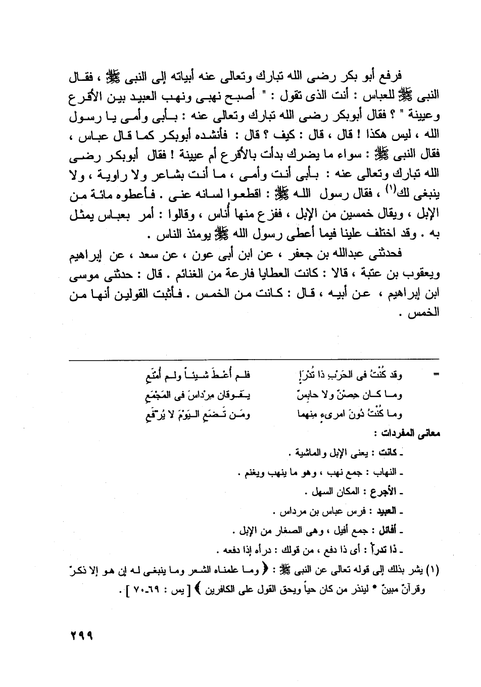 فقال النبي صلّى اللَّه عليه وسلّم للعباس: أنت الّذي تقول: «أصبح نهبي ونهب العبيد بين الأقرع وعيينة» ؟ فقال أبو بكر رضى اللَّه تبارك وتعالى عنه: بأبي وأمى يا رسول اللَّه، ليس هكذا! قال، قال: كيف؟ قال: فأنشده أبو بكر كما قال عباس، فقال النبي صلّى اللَّه عليه وسلّم: سواء ما يضرك بدأت بالأقرع أم عيينة! فقال أبو بكر رضى اللَّه تبارك وتعالى عنه: بأبي أنت وأمى، ما أنت بشاعر ولا راوية، ولا ينبغي لك [ (1) ] ، فقال رسول اللَّه صلّى اللَّه عليه وسلّم: اقطعوا لسانه عنى.