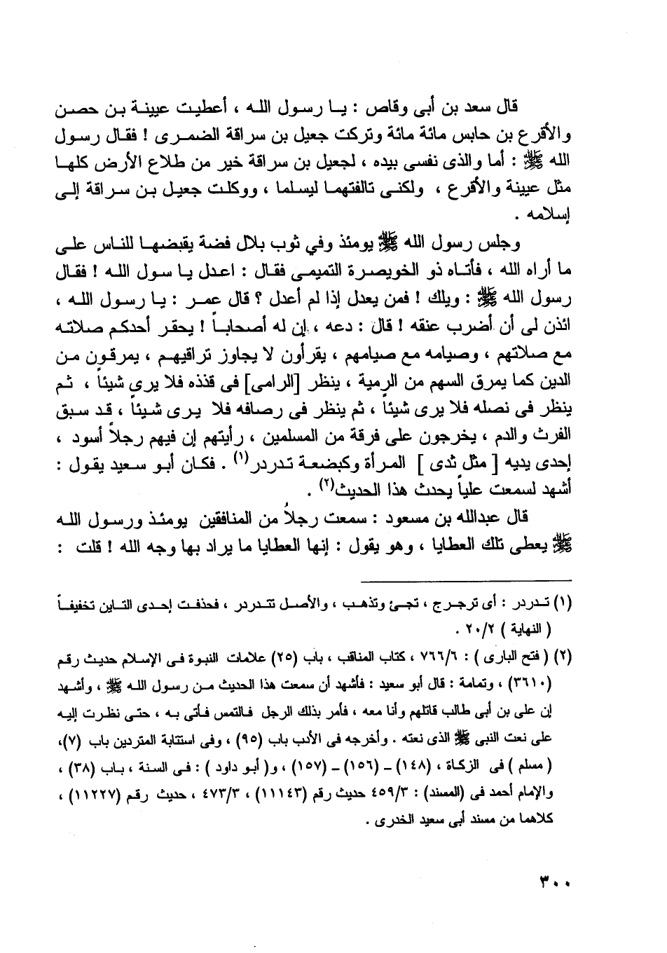 [ (2) ] (فتح الباري) : 6/ 766، كتاب المناقب، باب (25) علامات النبوة في الإسلام حديث رقم (3610) ، وتمامة: قال أبو سعيد: فأشهد أن سمعت هذا الحديث من رسول اللَّه صلّى اللَّه عليه وسلّم، وأشهد إن على بن أبى طالب قاتلهم وأنا معه، فأمر بذلك الرجل فالتمس فأتى به، حتى نظرت إليه على نعت النبي صلّى اللَّه عليه وسلّم الّذي نعته. وأخرجه في الأدب باب (95) ، وفي استتابة المرتدين باب (7) ، (مسلم) في الزكاة، (148) - (156) - (157) ، و (أبو داود) : في السنة، باب (38) ، والإمام أحمد في (المسند) : 3/ 459 حديث رقم (11143) ، 3/ 473، حديث رقم (11227) ، كلاهما من مسند أبى سعيد الخدريّ.