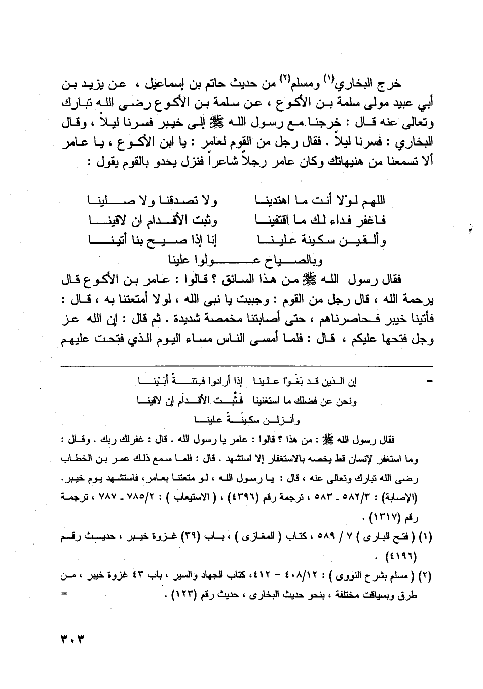 خرج البخاري [ (1) ] ومسلم [ (2) ] من حديث حاتم بن إسماعيل، عن يزيد بن أبي عبيد مولى سلمة بن الأكوع، عن سلمة بن الأكوع رضى اللَّه تبارك وتعالى عنه قال: خرجنا مع رسول اللَّه صلّى اللَّه عليه وسلّم إلى خيبر فسرنا ليلا، وقال البخاري: فسرنا ليلا. فقال رجل من القوم لعامر: يا ابن الأكوع، يا عامر ألا تسمعنا من هنيهاتك وكان عامر رجلا شاعرا فنزل يحدو بالقوم يقول: