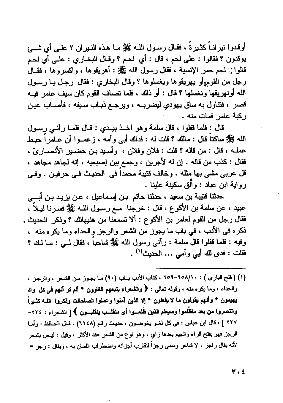 [ (1) ] (فتح الباري) : 10/ 658- 659، كتاب الأدب باب (90) ما يجوز من الشعر، والرجز، والحداء، وما يكره منه، وقوله تعالى: وَالشُّعَراءُ يَتَّبِعُهُمُ الْغاوُونَ* أَلَمْ تَرَ أَنَّهُمْ فِي كُلِّ وادٍ يَهِيمُونَ* وَأَنَّهُمْ يَقُولُونَ ما لا يَفْعَلُونَ* إِلَّا الَّذِينَ آمَنُوا وَعَمِلُوا الصَّالِحاتِ وَذَكَرُوا اللَّهَ كَثِيراً وَانْتَصَرُوا مِنْ بَعْدِ ما ظُلِمُوا وَسَيَعْلَمُ الَّذِينَ ظَلَمُوا أَيَّ مُنْقَلَبٍ يَنْقَلِبُونَ [الشعراء: 224- 227] ، قال ابن عباس: في كل لغو يخوضون، حديث رقم (6148) . قال الحافظ: وأما الرجز فهو بفتح الراء والجيم بعدها زاي، وهو نوع من الشعر عند الأكثر، وقيل: ليس بشعر لأنه يقال راجز، لا شاعر وسمى رجزا لتقارب أجزائه واضطراب اللسان به، ويقال: رجز