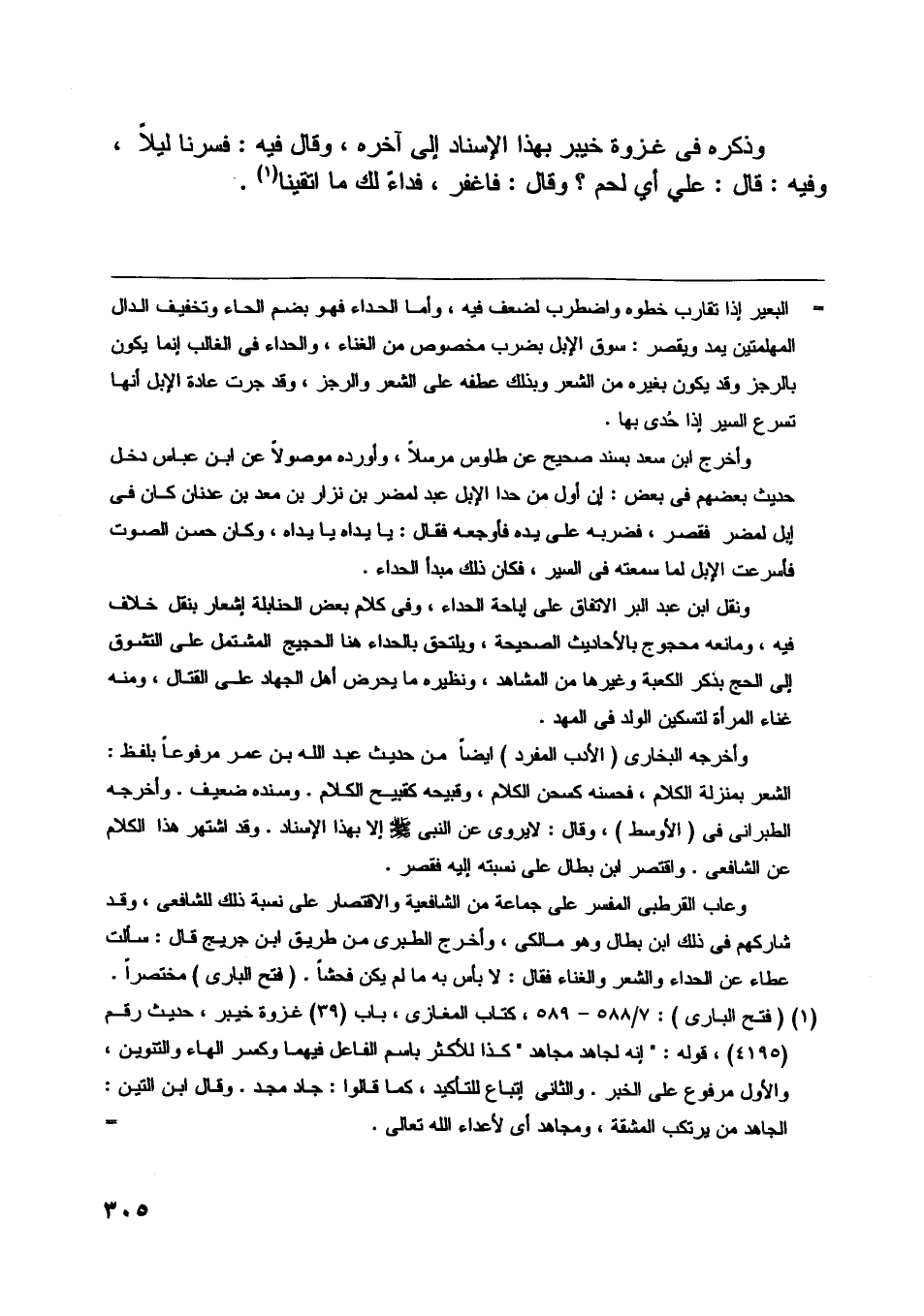 وعاب القرطبي المفسر على جماعة من الشافعية والاقتصار على نسبة ذلك للشافعي، وقد شاركهم في ذلك ابن بطال وهو مالكي، وأخرج الطبري من طريق ابن جريج قال: سألت عطاء عن الحداء والشعر والغناء فقال: لا بأس به ما لم يكن فحشا. (فتح الباري) مختصرا.