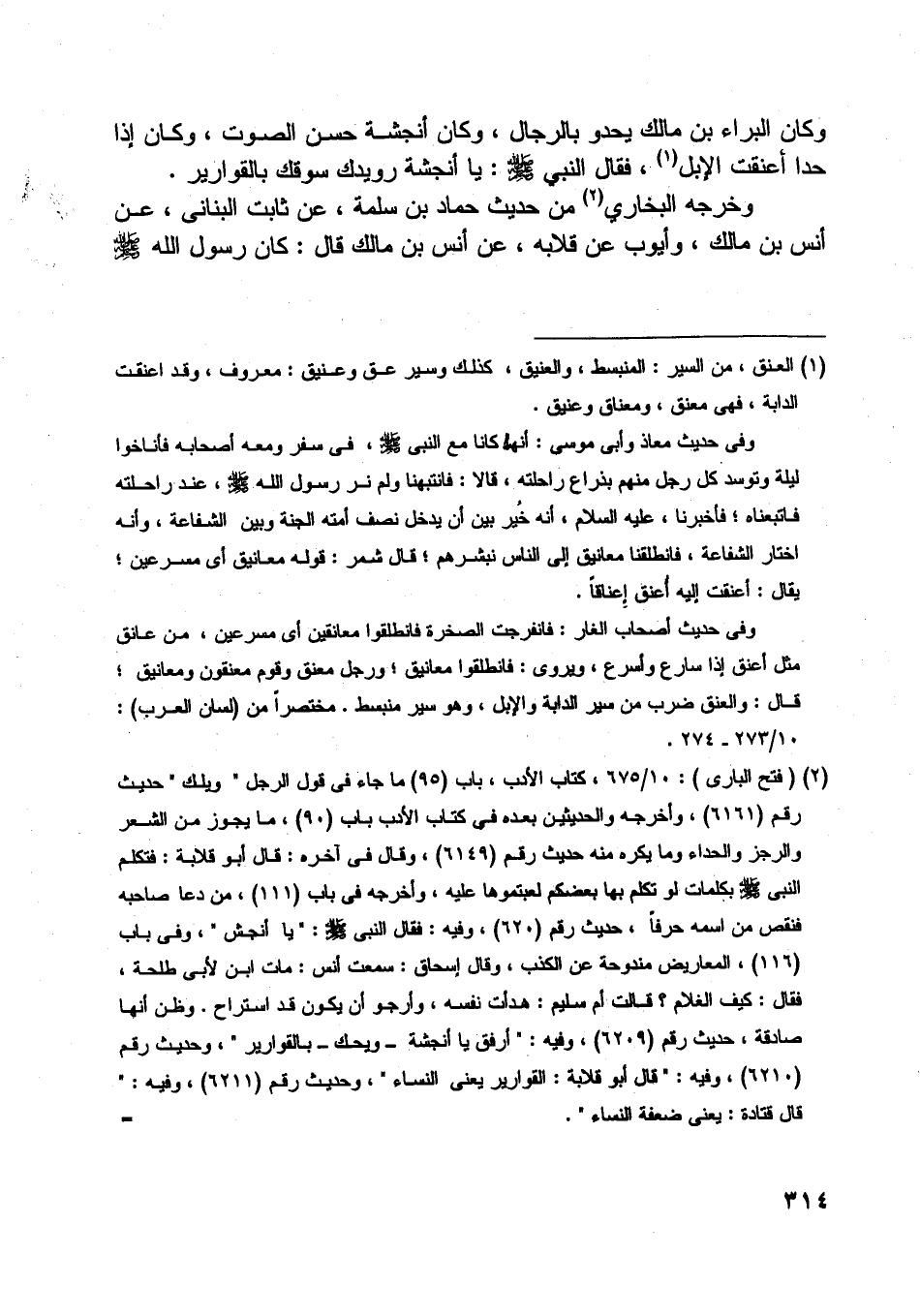 وكان البراء بن مالك يحدو بالرجال، وكان أنجشة حسن الصوت، وكان إذا حدا أعنقت الإبل [ (1) ] ، فقال النبي صلّى اللَّه عليه وسلّم: يا أنجشة رويدك سوقك بالقوارير.